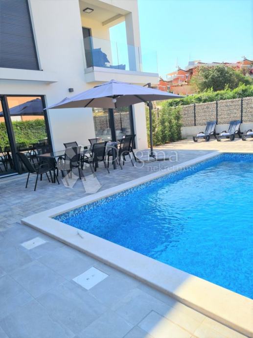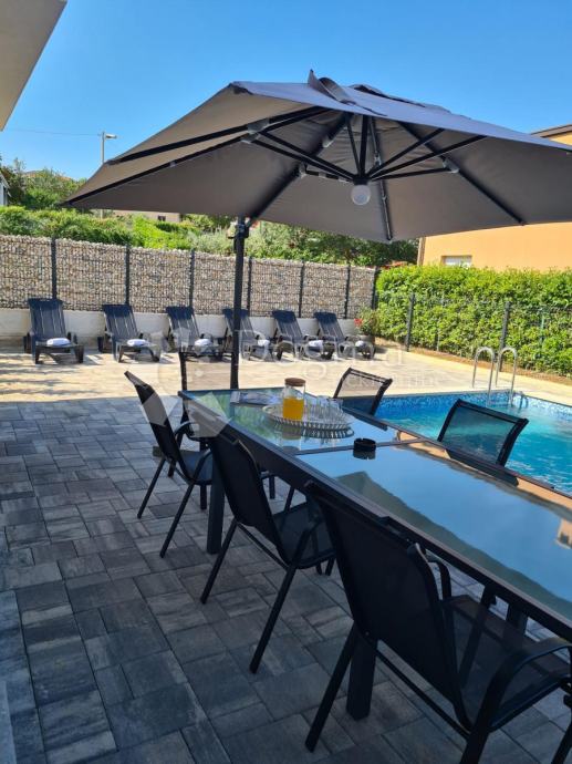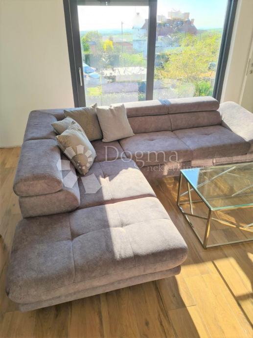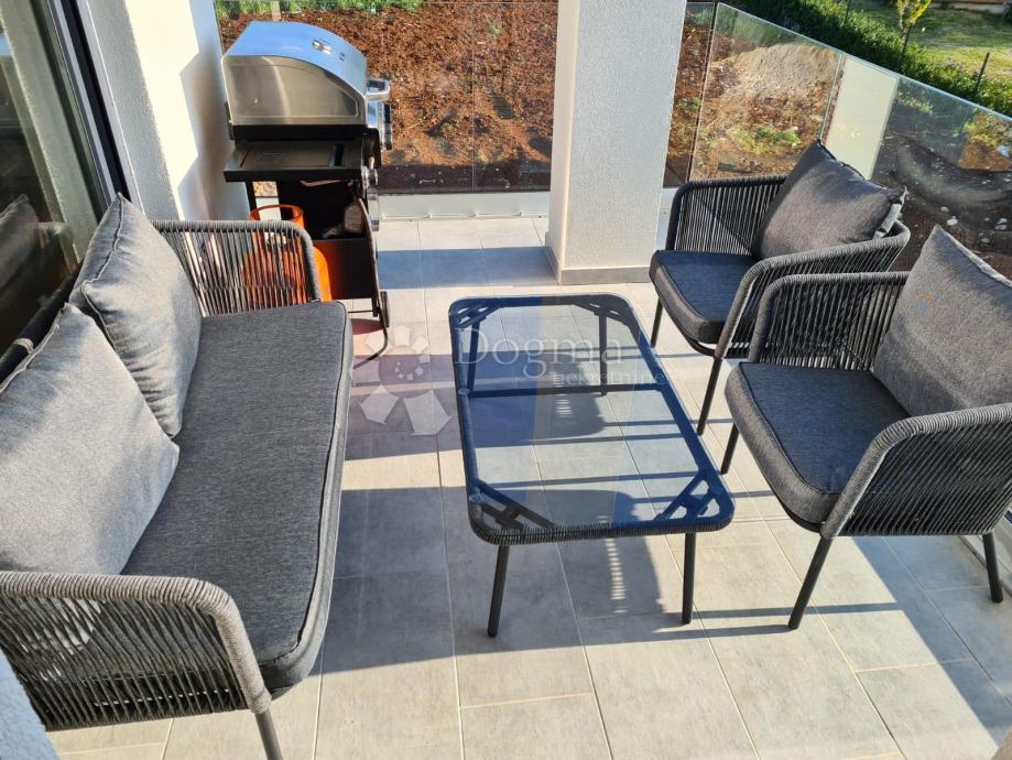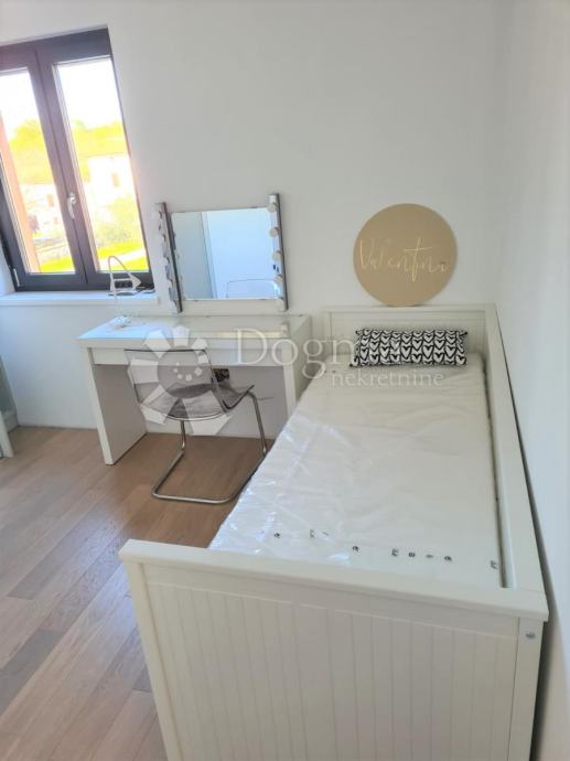 Stan se sastoji od ulaznog hodnika, spremišta, povezanog dnevnog boravka, kuhinje i blagovaonice te 2 spavaće sobe i kupaonice. Stan je uređen dizajnerskim namještajem izrađenim po mjeri te je uključen u cijenu. Iz dnevnog boravka se kroz kliznu stijenu izlazi na sunčalište sa predivnim bazenom. U nastavku se nalazi dvorište te parking.
