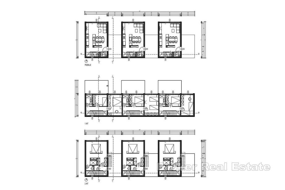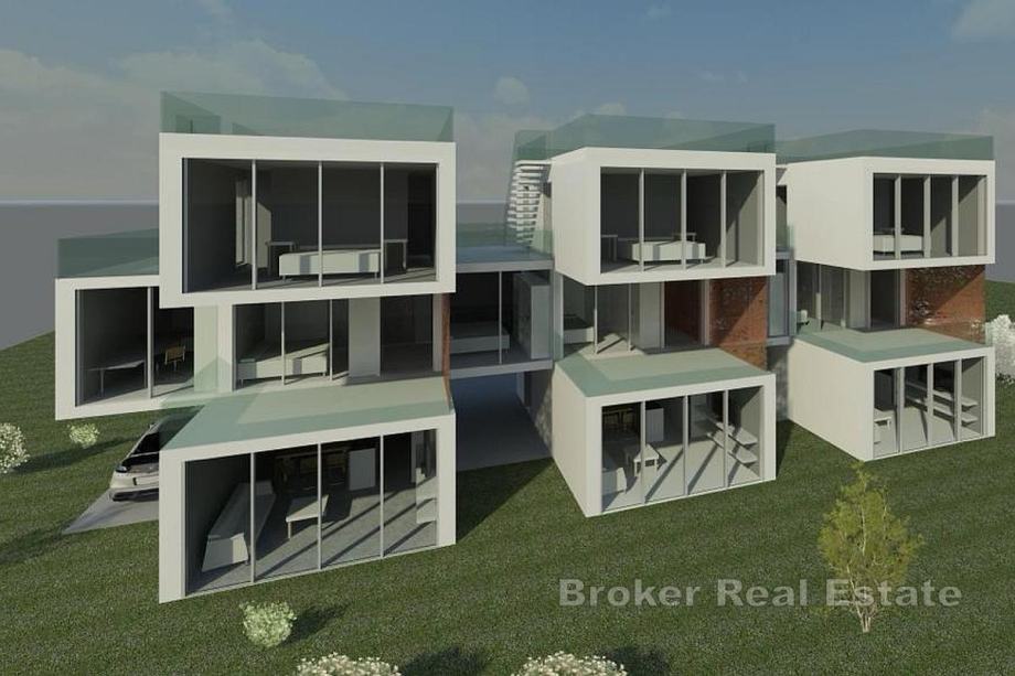 U prizemlju objekta nalazi se prostrani dnevni boravak otvorenog koncepta s blagovaonicom te dnevni dio s direktnim izlazom u vrt. Ova etaža dodatno sadrži gostinjski toalet, a unutarnje stubište vodi na prvi kat gdje su smještene dvije udobne spavaće sobe. Jedna od soba ima izlaz na vlastiti balkon, dok obje dijele moderno uređenu kupaonicu s kvalitetnom keramikom i sanitarijama koju može odabrati kupac prema vlastitoj želji. Na zadnjem katu smještena je prostrana master spavaća soba koja nudi maksimalnu udobnost i privatnost. Soba uključuje vlastitu kupaonicu, prostrani walk-in ormar te izlaz na veliku terasu s očaravajućim pogledom na more. Vila je opremljena podnim grijanjem u kupaonicama te klima uređajima u svim prostorijama, što omogućuje ugodan boravak tijekom cijele godine. Prodaje se nenamještena, što budućem vlasniku ostavlja slobodu u opremanju prema vlastitom ukusu i stilu. Uz objekt je osigurano i jedno vanjsko parkirno mjesto, a svi elementi vezani uz uređenje interijera i eksterijera mogu se dodatno dogovoriti s investitorom, uključujući ugradnju bazena ili namještaja po mjeri.