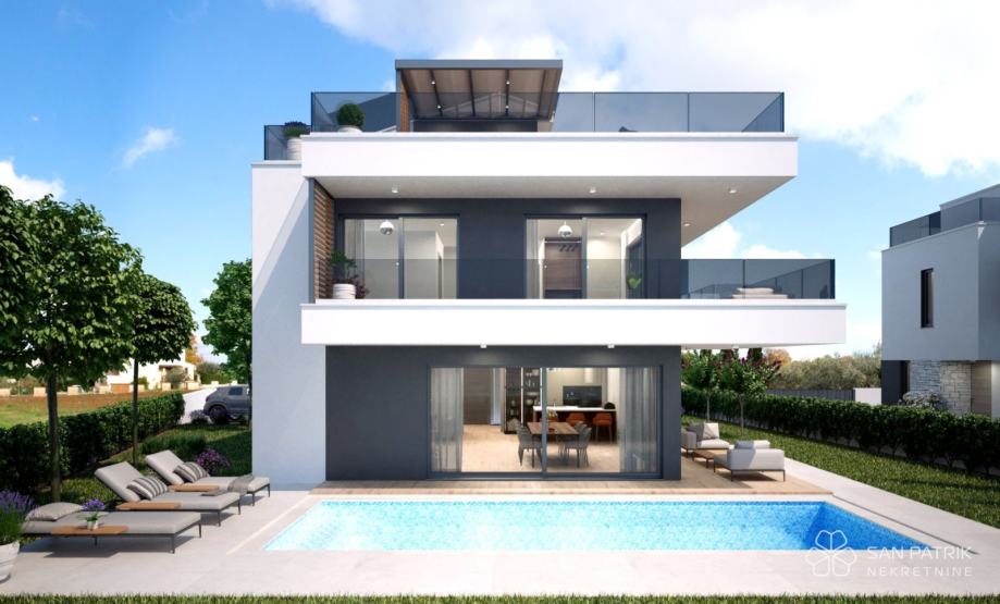 Na parceli površine 570 m2 prodaje se vila ukupne površine 233 m2 koja se na tri etaže (prizemlja i dva kata) sastoji od 3 spavaće sobe, 4 kupaonice, dnevnog boravka sa kuhinjom i blagavaonicom, wellness, sauna, 4 terase, vanjskog bazena u prizemlju te dva parkirna mjesta u dvorištu.