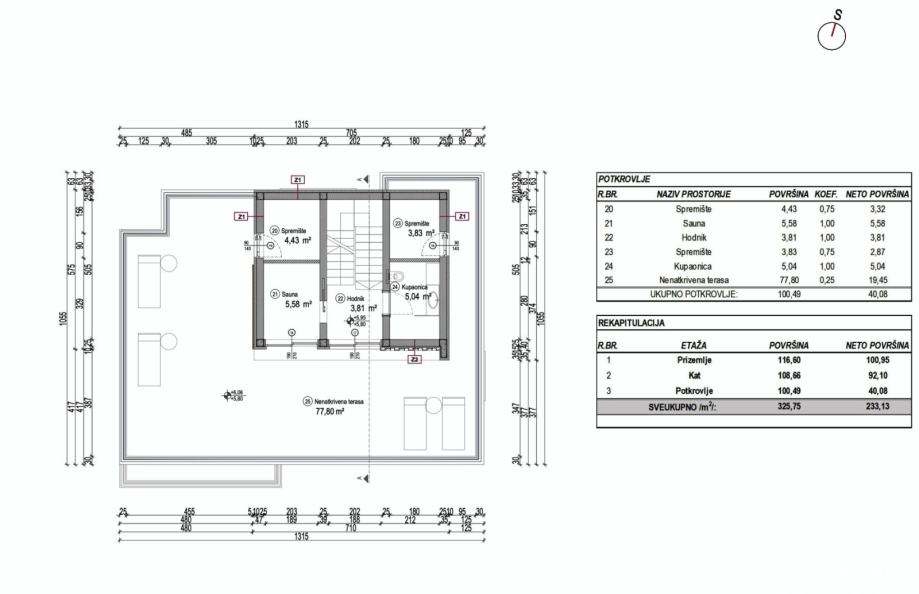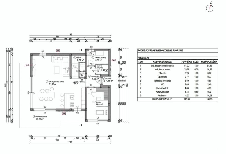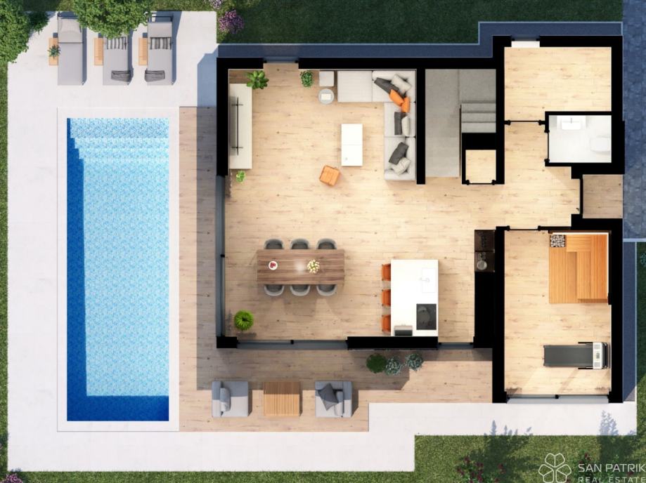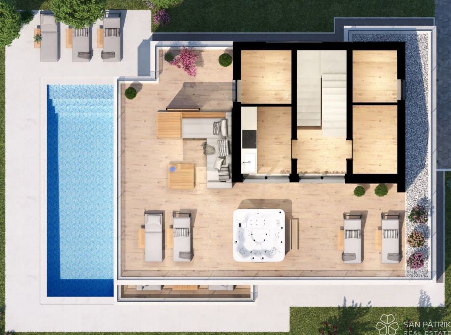 Vila K1 – prizemlje + 2. kata – stambena površina 233 m2 (3 spavaće sobe + 3 kupaonice + 4 terasa + wellnes zona + teretana + bazen) + 2 parkirna mjesta = 825.000 EUR (s uključenim PDV-om)