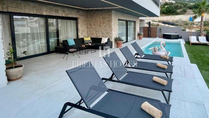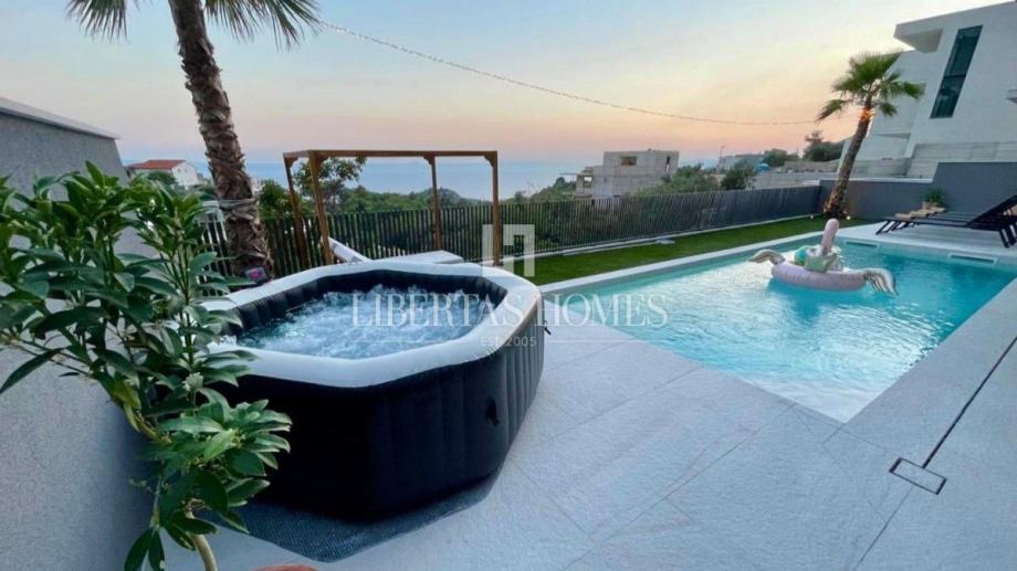 Predstavljamo na prodaju luksuznu vilu novije gradnje s bazenom i otvorenim pogledom na more, smještenu u mirnom i atraktivnom okruženju. Kuća se sastoji od tri odvojene stambene jedinice raspoređene kroz prizemlje i dvije etaže, što je čini idealnom za život većih obitelji, više generacija ili kao investiciju za turistički najam.