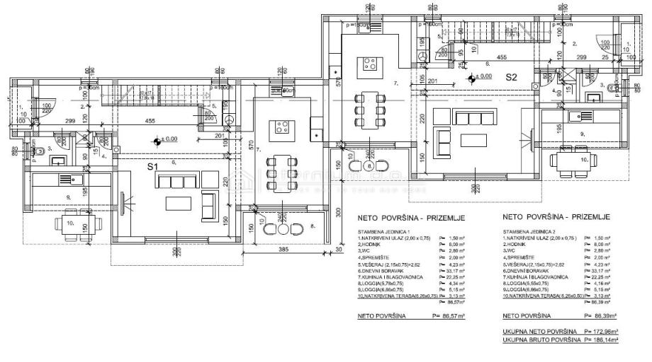 Činiti će ih prizemlje i prvi kat, orijentacija će biti sjever-jug, a sa južne strane u suterenu će imati svaka svoju garažu veličine 46m2 koja je dostatna za parking 2 automobila. Pokraj garaža postoji mogućnost dodatnih vanjskih parkinga.
