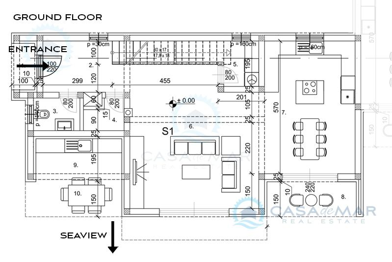 Na prizemlju se nalaze ulazni hodnik, open space dnevni boravak koji ima izlaz na prostranu terasu, kuhinja, blagovaonica, spremište i vešeraj.