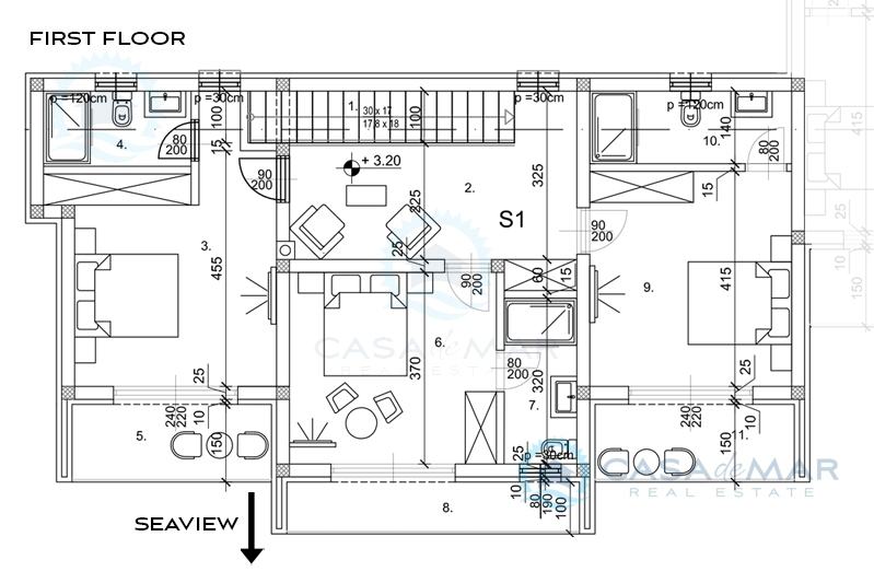 Na prvom katu se nalaze tri spavaće sobe svaka sa vlastitom kupaonicom i izlazom na vlastitu loggiu.