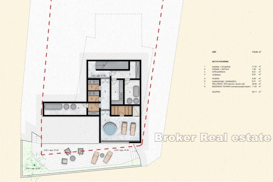 Vila se sastoji od 3 etaže, suterena, prizemlja i prvog kata. Na suterenu se nalaze strojarnica i vešeraj, garderobe i spremišta, wellness i spa sa jacuzzijem, saunom i tušem.