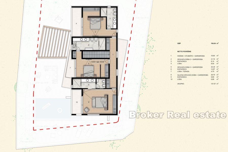 Unutarnje stubište vodi do prvog kata na kojem se nalaze još tri spavaće sobe od kojih svaka ima vlastitu kupaonicu i garderobu te izlaz na terasu ili lođu.