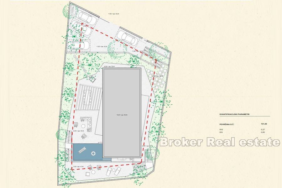 Prekrasna vila površine 377m2 smjestila se na blago nakošenom zemljištu veličine 571m2. Nekretnina se nalazi u kompleksu s druge dvije vile koje su trenutno u procesu gradnje. Svaka vila ima posebni ulaz i parking te su u potpunosti odvojene dok je pristupni put zajednički.