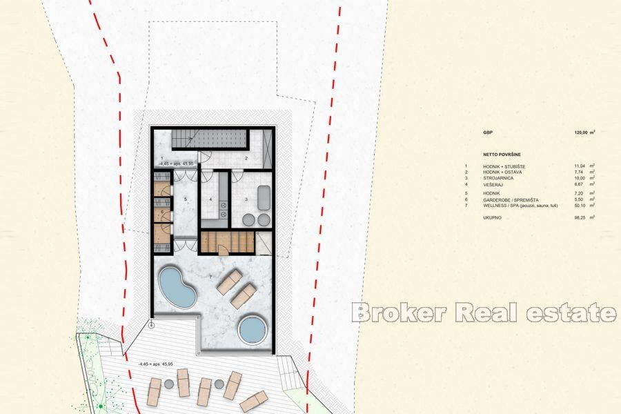 Nekretnina je sastoji od 3 etaže, suterena, prizemlja i prvog kata. Na suterenu su smještene strojarnica i vešeraj, garderoba i spremište, te wellness i spa prostori sta jacuzzijem, saunom i tušem.