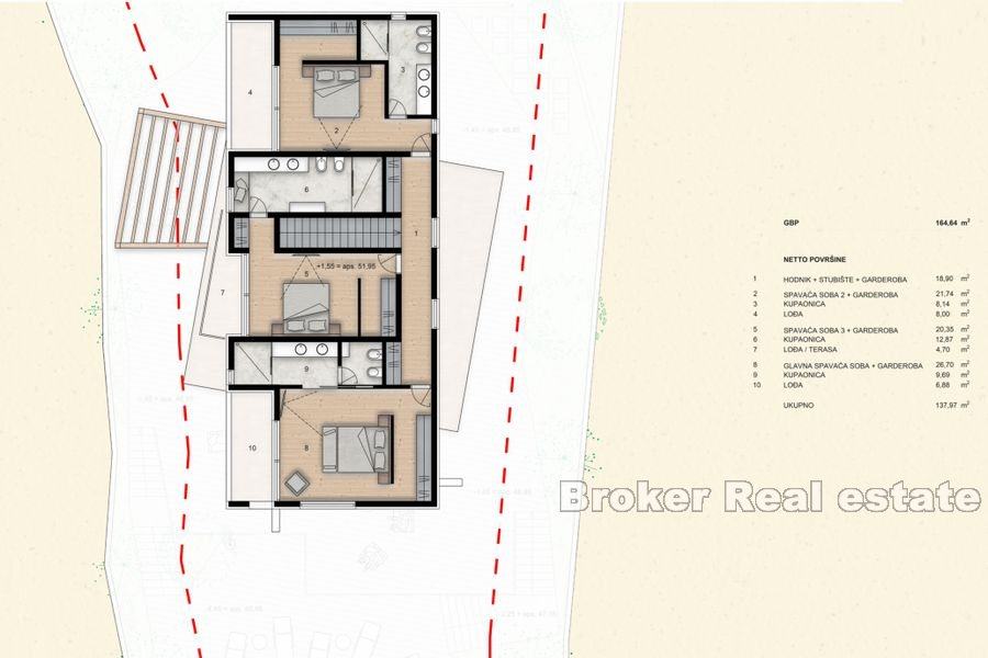 Na prvom katu su se smjestile još tri spavaće sobe od kojih svaka ima vlastitu kupaonicu i garderobu te izlaz na lođu ili terasu.