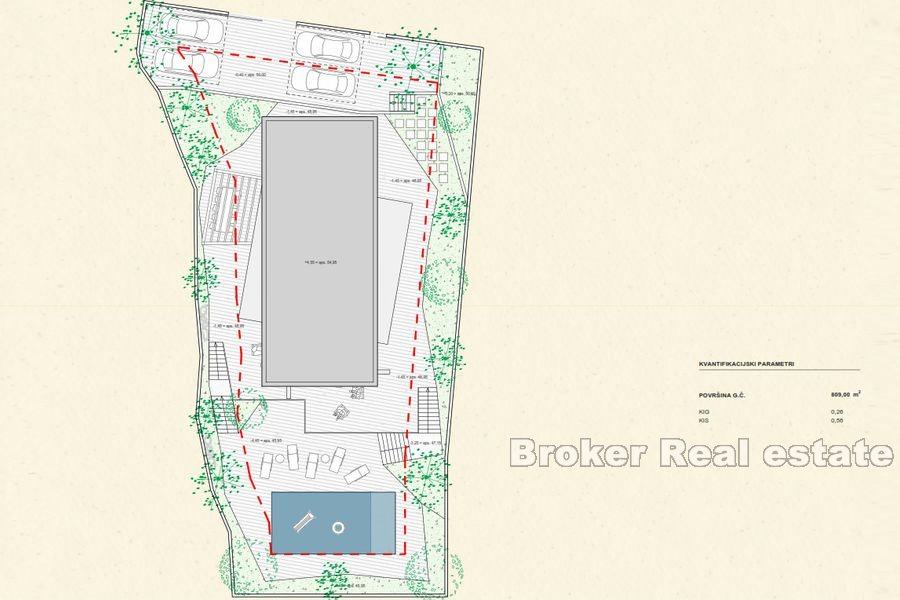 Moderna vila smještena na povišenom terenu. Nekretnina je smještena u Vodicama na zemljištu položenom s blagim nagibom što vili nudi izuzetan pogled na more. Vila stambene površine 391 m2 smještena je na parceli veličine 740m2 te je građena u kompleksu s još dvije vile koje imaju zajednički pristupni put no odvojene garaže i ulaze.