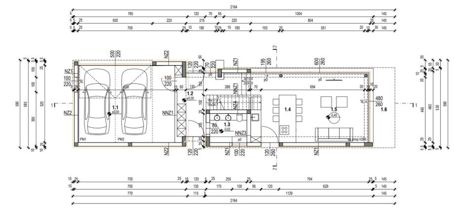 - Prizemlje: prostrani dnevni boravak, kuhinja i blagovaona u open-space koncepciji, WC, hodnik i garaža s dva parkirna mjesta.