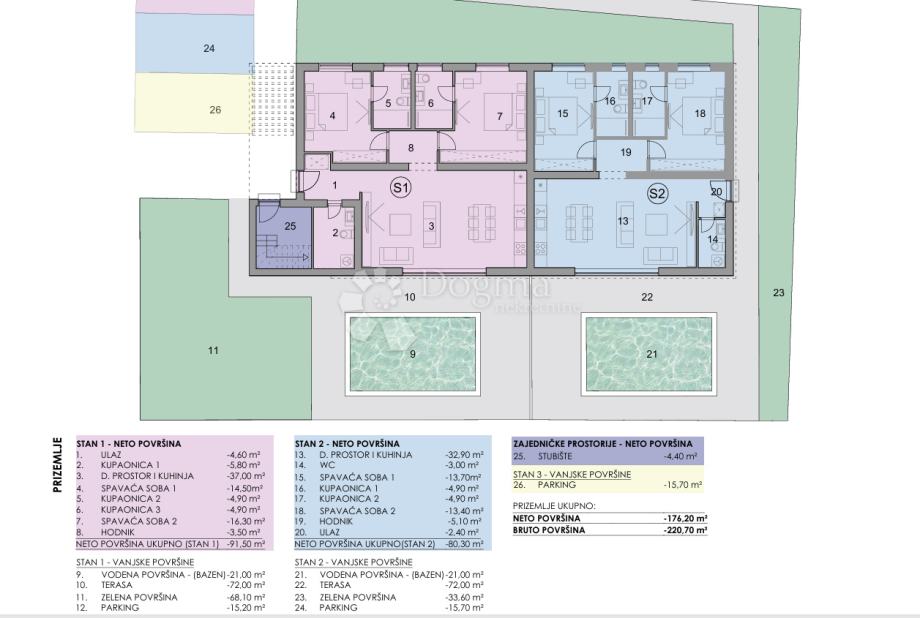 Dva prostrana stana u prizemlju jedan od 91m2 i drugi od 80m2 imaju vlastite bazene te pripadajuće zelene površine,idealne za opuštanje i privatnost gostiju.Savršeni su za obiteljski odmor ili luksuzni najam.Oba stana imaju terase od 72m2.