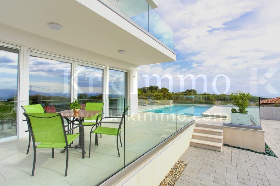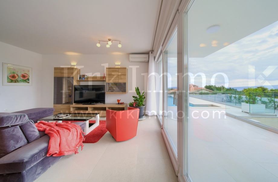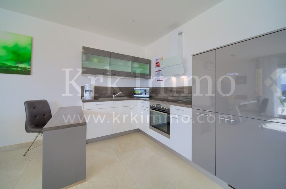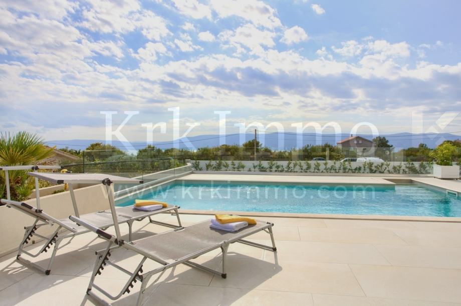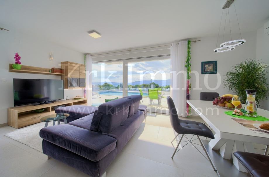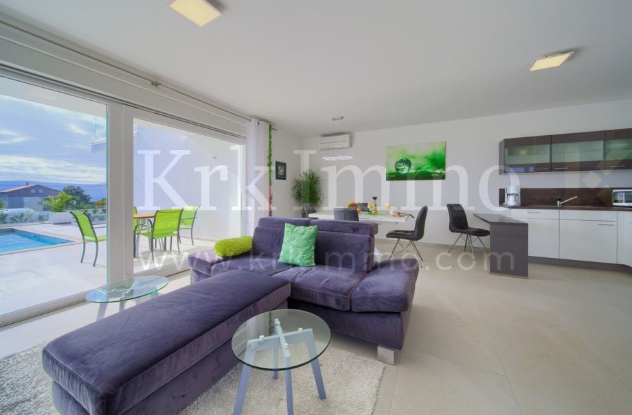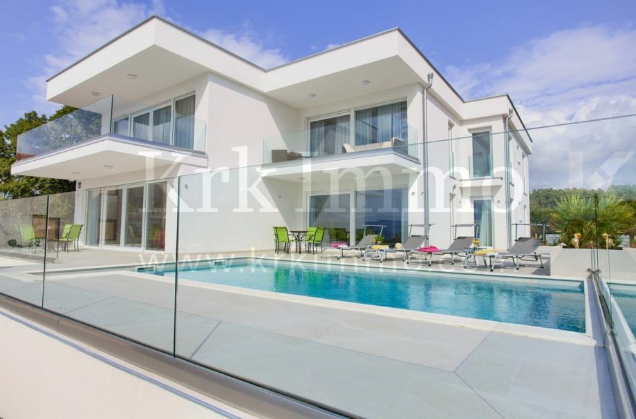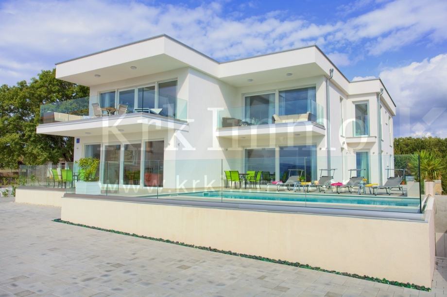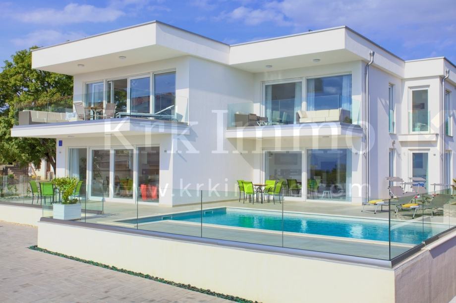 Prodaje se moderna villa s četiri namještena, opremljena apartmana i bazenom na lijepoj, mirnoj lokaciji u okolici grada Krka. Sveukupna stambena površina ville iznosi 470 m2, a ima 3 etaže: podrum, prizemlje i kat. U podrumu se nalaze ured i vešeraj, dva apartmana smještena su u prizemlju, a dva su na katu. Svaki apartman ima dvije spavaće sobe, dvije kupaonice, modernu kuhinju, blagovaonicu i dnevni boravak s izlazom na veliku terasu s prekrasnim pogledom na more. Apartmani su u potpunosti opremljeni i namješteni.