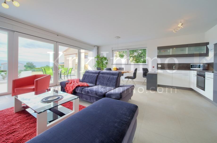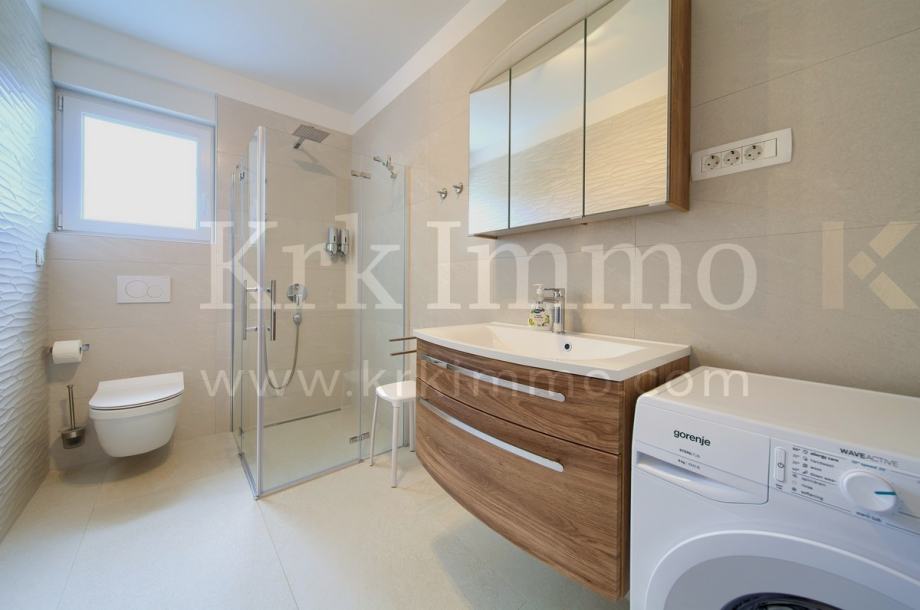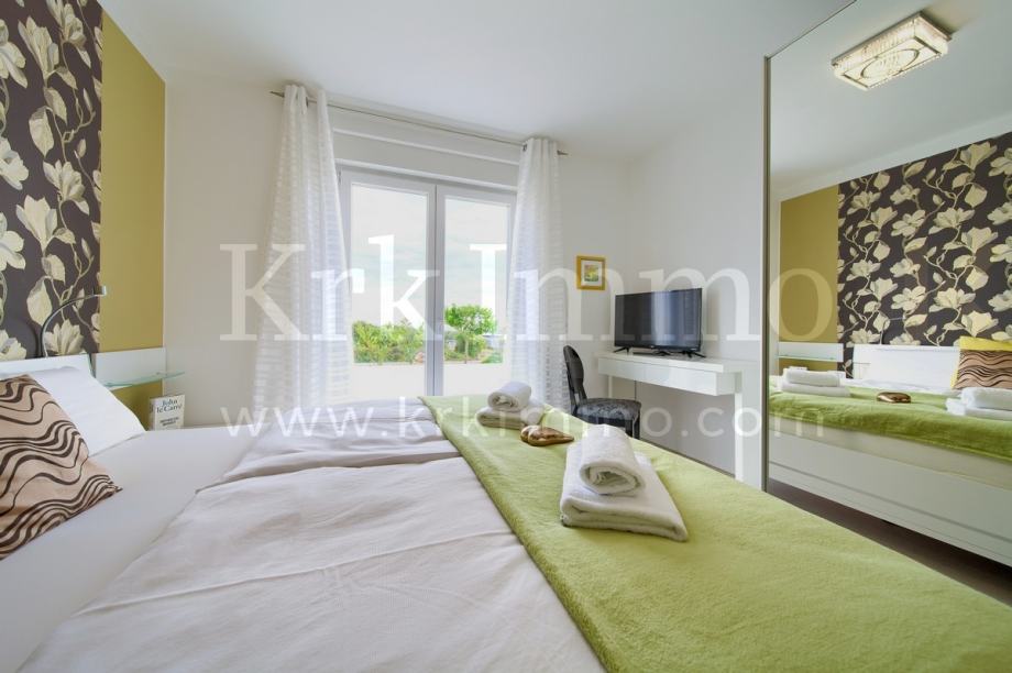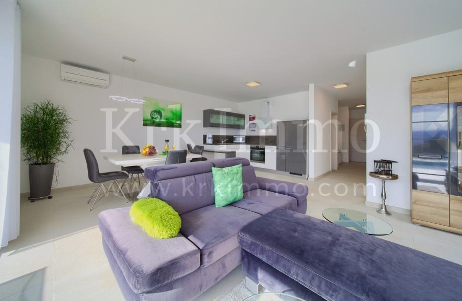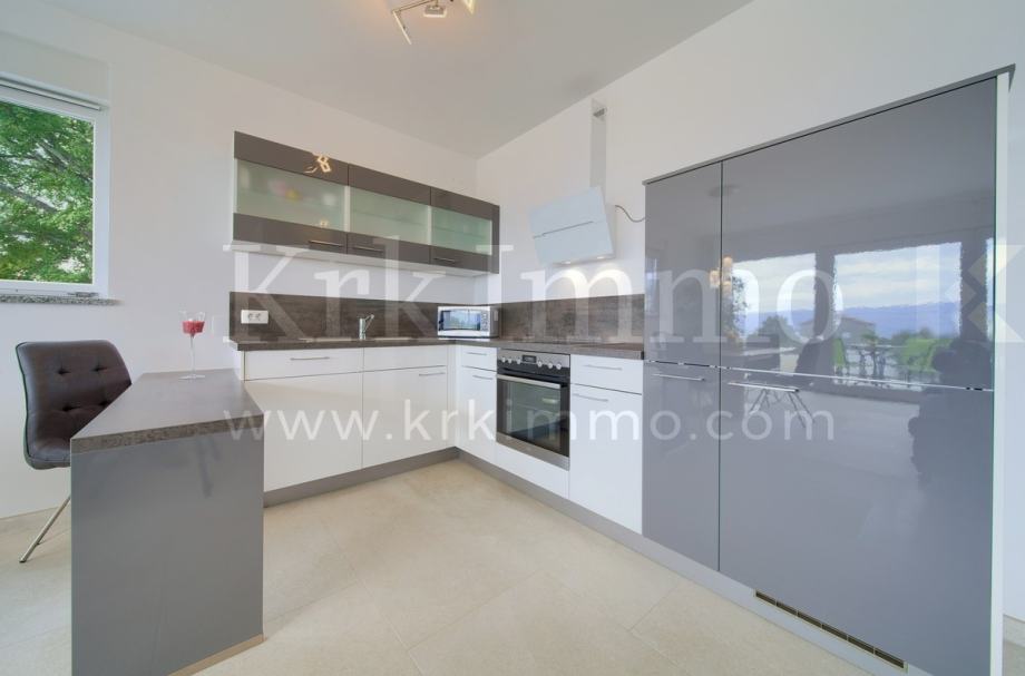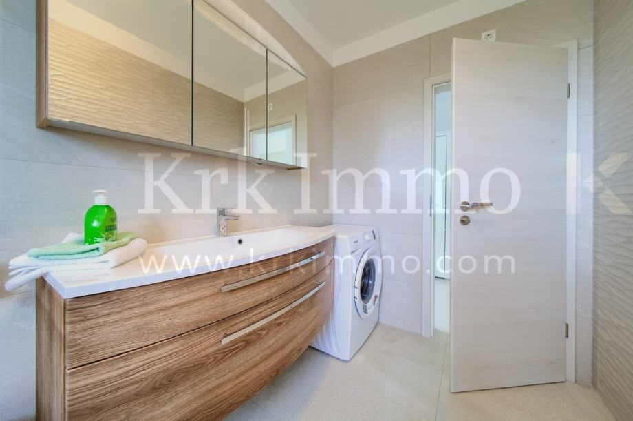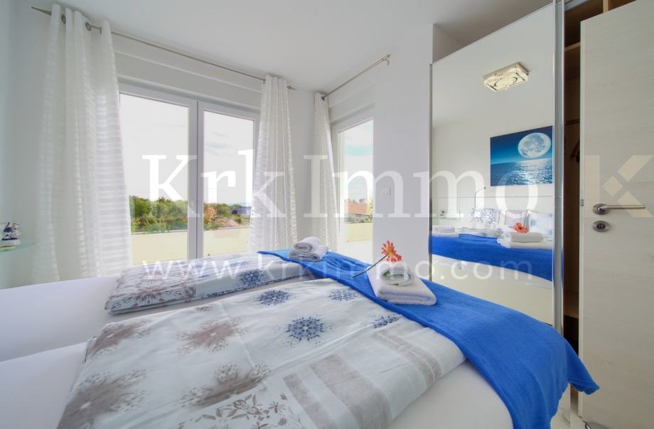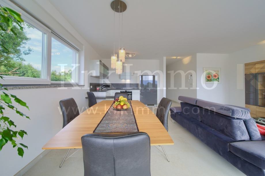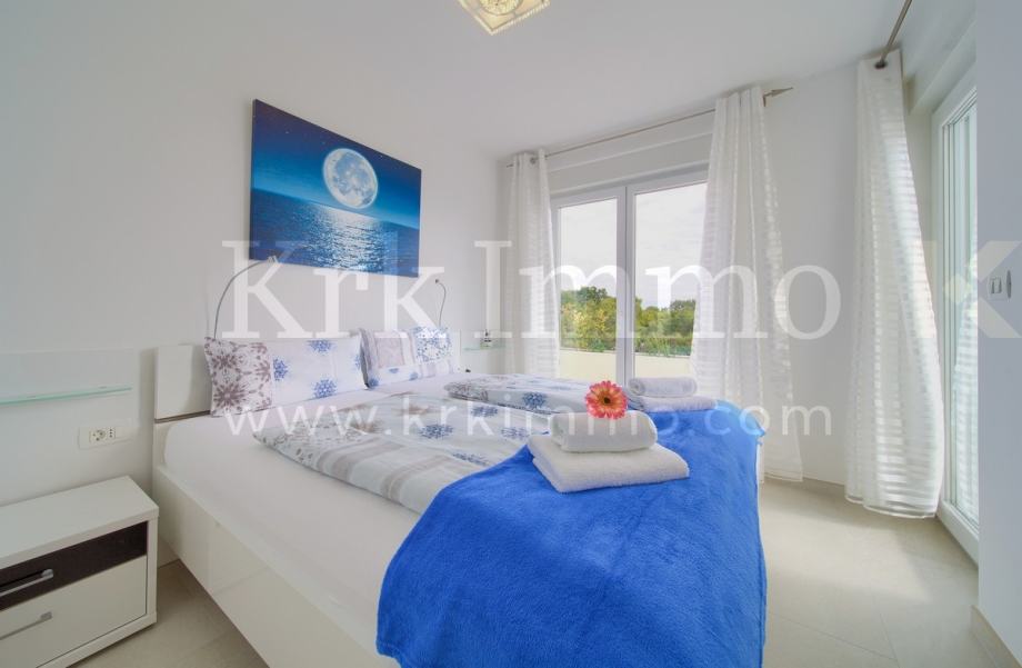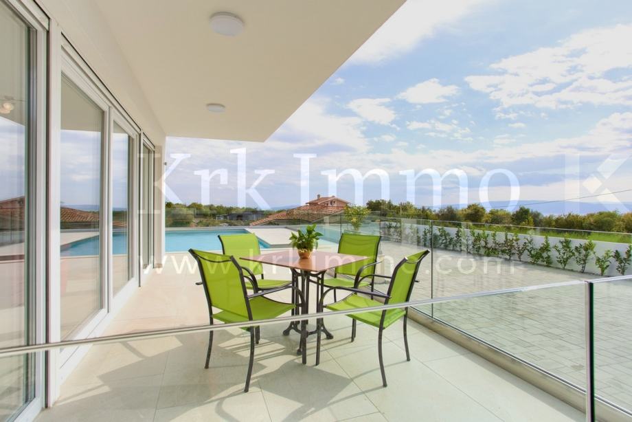 Prodaje se moderna villa s četiri namještena, opremljena apartmana i bazenom na lijepoj, mirnoj lokaciji u okolici grada Krka. Sveukupna stambena površina ville iznosi 470 m2, a ima 3 etaže: podrum, prizemlje i kat. U podrumu se nalaze ured i vešeraj, dva apartmana smještena su u prizemlju, a dva su na katu. Svaki apartman ima dvije spavaće sobe, dvije kupaonice, modernu kuhinju, blagovaonicu i dnevni boravak s izlazom na veliku terasu s prekrasnim pogledom na more. Apartmani su u potpunosti opremljeni i namješteni.