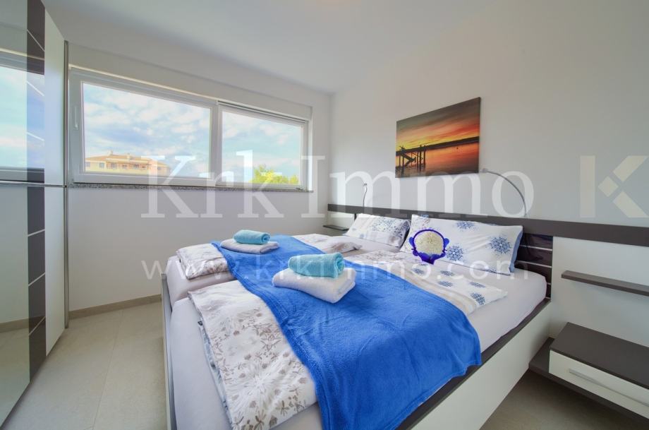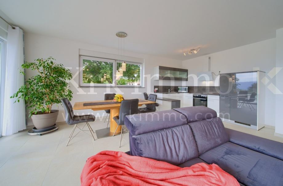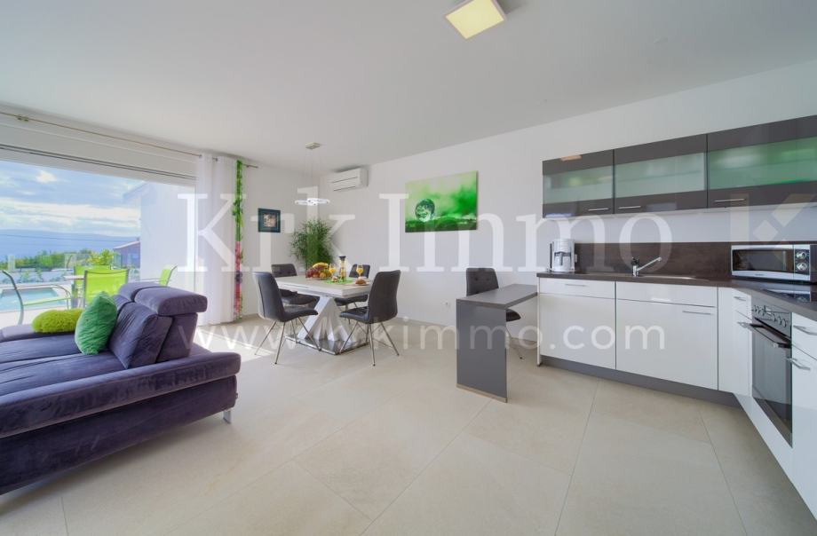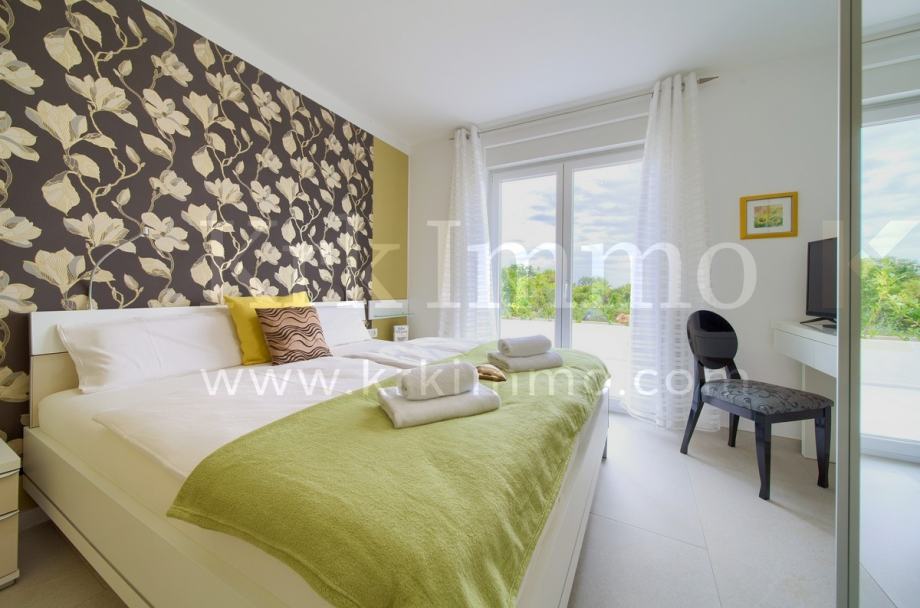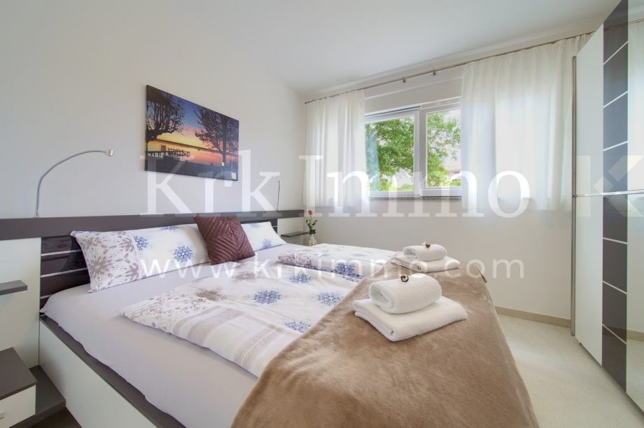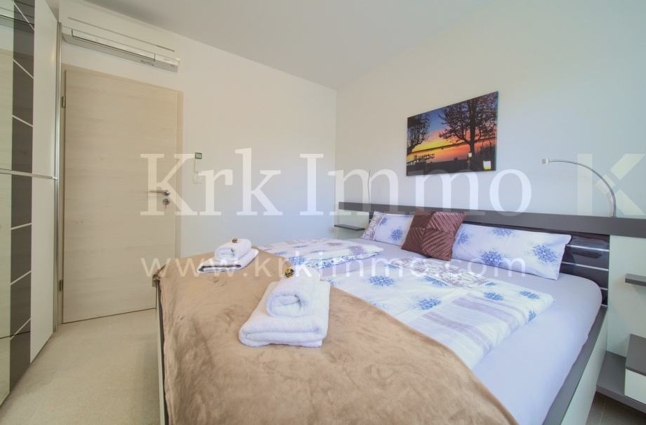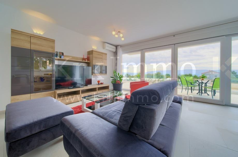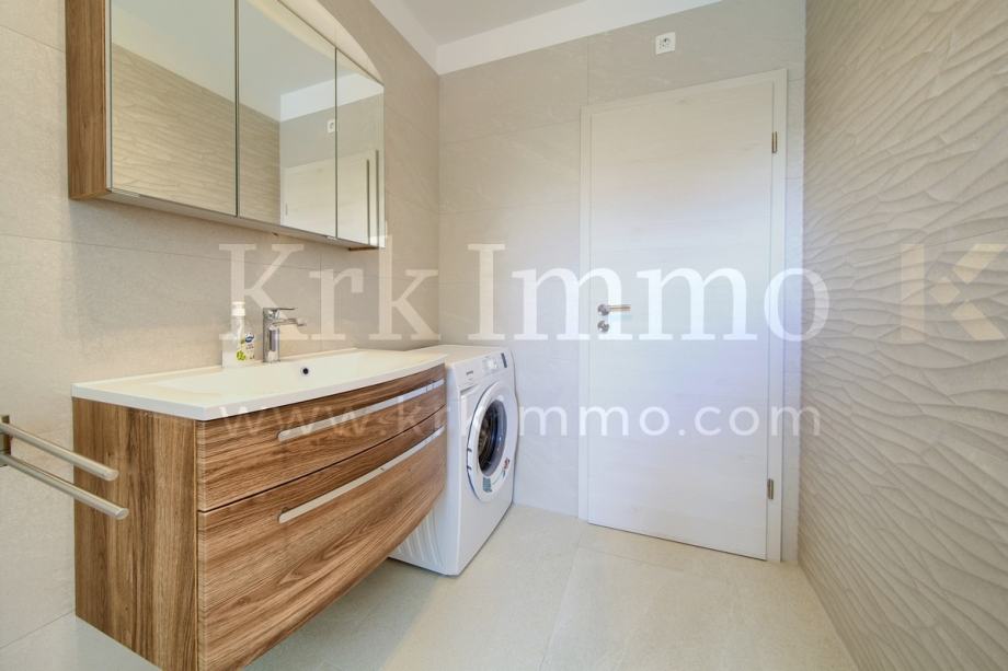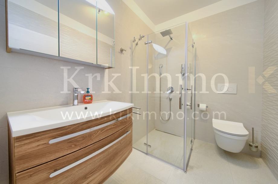 Prodaje se moderna villa s četiri namještena, opremljena apartmana i bazenom na lijepoj, mirnoj lokaciji u okolici grada Krka. Sveukupna stambena površina ville iznosi 470 m2, a ima 3 etaže: podrum, prizemlje i kat. U podrumu se nalaze ured i vešeraj, dva apartmana smještena su u prizemlju, a dva su na katu. Svaki apartman ima dvije spavaće sobe, dvije kupaonice, modernu kuhinju, blagovaonicu i dnevni boravak s izlazom na veliku terasu s prekrasnim pogledom na more. Apartmani su u potpunosti opremljeni i namješteni.