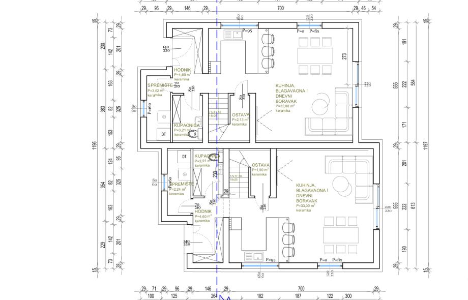 Sustav gradnje bit će kombinacija opeke(29cm) i armiranog betona. Stiropor izolacija od 15 cm u kombinaciji sa kvalitetnom PVC stolarijom sa troslojnim staklima,alu roletama te komarnicima.