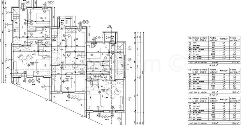 Na prodaju su tri kuće u novogradnji u sklopu modernog triplexa koji je udaljen svega 170m od lokalne plaže. Kuća A ima ukupnu stambenu površinu 165 m2 i cijenu od 577.500€ kuća B od 145 m2 ima cijenu od 507.500€, a kuća C od 165 m2 dolazi s cijenom od 577.500€ .U prizemlju svake od kuća nalazi se ulaz sa stubištem i garderobom, dnevni boravak s kuhinjom i blagovaonicom, gostinska soba, spremište, kupaonica, natkriveni ulaz te natkrivena terasa. Na prvom katu svake kuće se nalaze dvije spavaće sobe, kupaonica, toalet, hodnik te po dvije loggie. Drugi kat se sastoji od stubišta i natkrivenog i nenatkrivenog dijela krovne terase s izrazito puno mjesta čija bi namjena bila sunčalište, manja ljetna kuhinja te postoji i opcija ugradnje jacuzzija. Svaka kuća ima dio dvorišta i parking mjesto s mogućnošću ugradnje bazena.