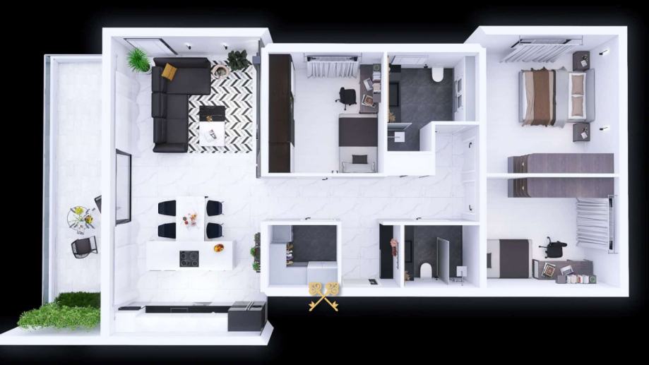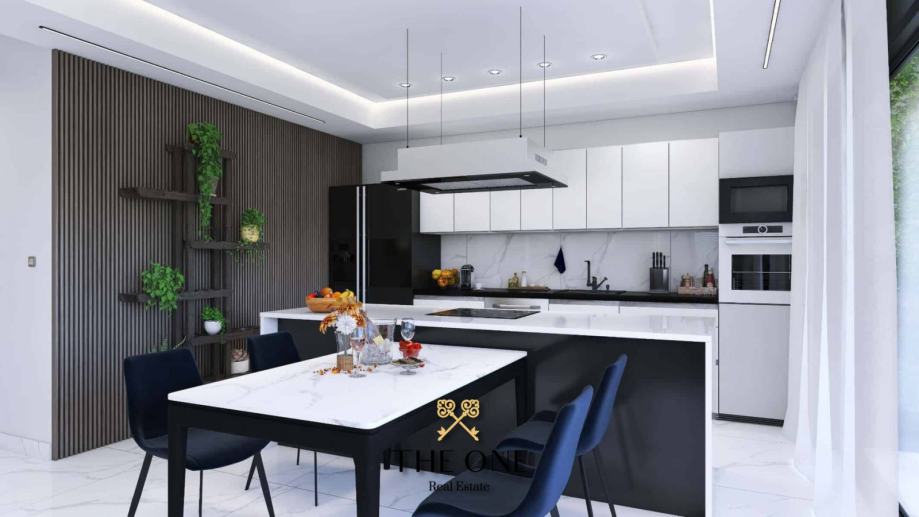 Ukupno ima šest apartmana i svaki se sastoji od 3 spavaće sobe, 2 kupaonice, ostave, open space koncept kuhinje s blagovaonicom, dnevnog boravka i natkrivene prostrane terase.