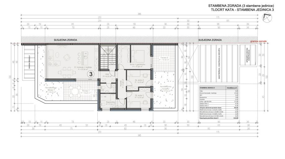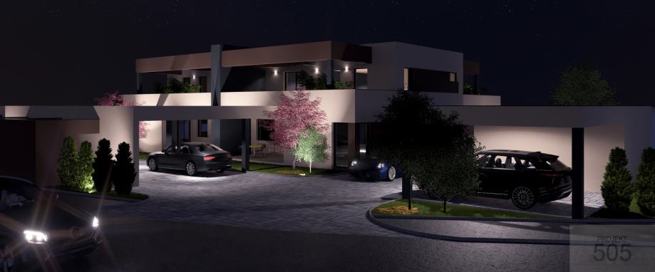 - Velike terase sa pergolama i nenatkrivene terase sa umjetnom travom oko stana