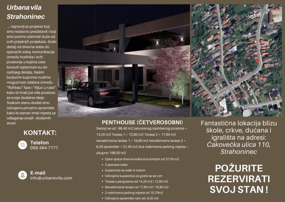 Pozdrav, ljubitelji nekretnina! Imam nevjerojatnu ponudu za vas. U predivnom naselju Strahoninec, smještenom u blizini Čakovca, prodajem prekrasan stan u modernoj Urbanoj vili koja se sastoji od 3 stana. Ova ekskluzivna vila nalazi se u mirnom dijelu grada, idealnom za obitelji i sve koji traže udobnost i mir u blizini svih važnih sadržaja kao što su škola, vrtić, crkva, sportski park, ljekarna, dućan i ostalo.