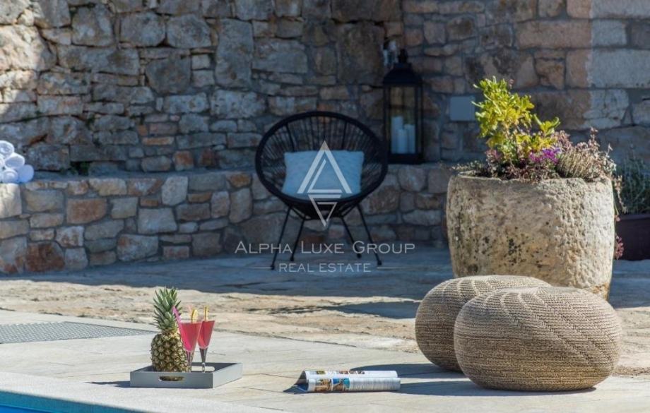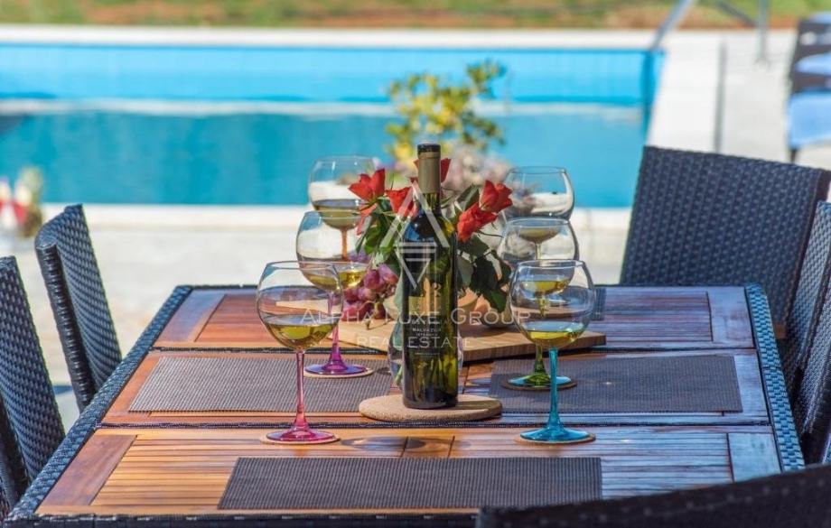 Vanjski život naglašava prostrana natkrivena terasa, pružajući slikoviti pogled na bujnu okolicu i privlačan bazen. Prostor oko bazena, poboljšan 2022. godine, uključuje sunčalište i ljetnu kuhinju tradicionalnog stila s kaminom, savršenu za blagovanje na otvorenom i zabavu.