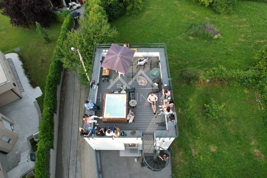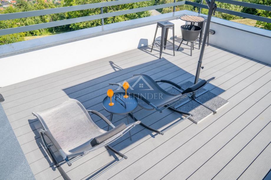 Nekretnina je dovršena 2019. godine i zamišljena je kao funkcionalan i udoban prostor. Sastoji se od prostranog, otvorenog dnevnog dijela od 42,6 m², velike garaže površine 37,45 m² te dodatne manje garaže u kojoj je uređena privatna teretana. Uz kuću se nalazi terasa od približno 30 m², a posebnu vrijednost daje velika krovna terasa od 40 m², opremljena masažnom kadom koja omogućuje potpuni odmor i privatnost.