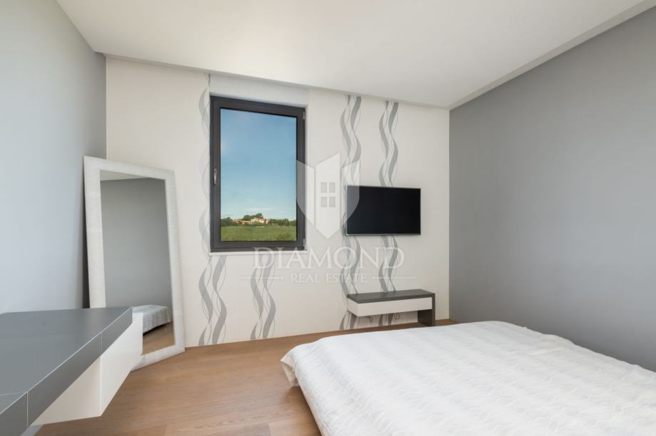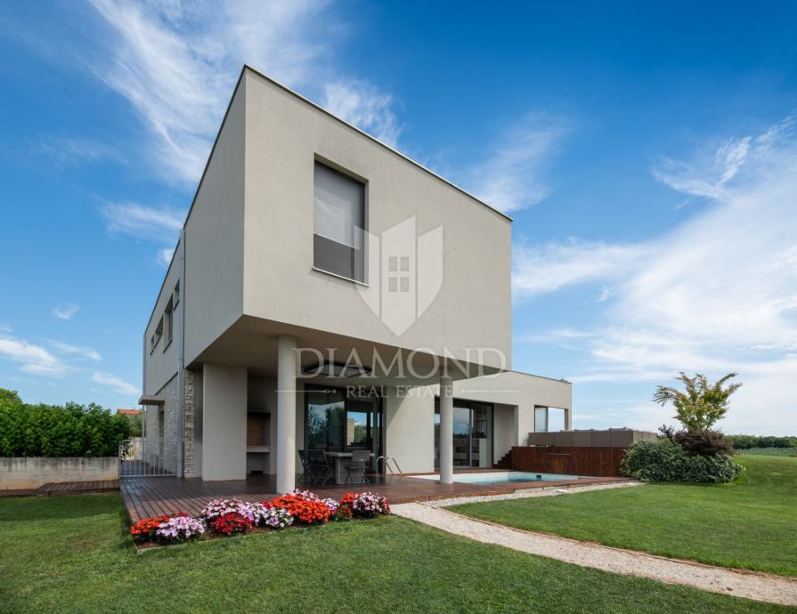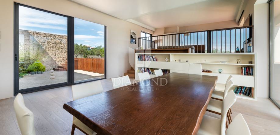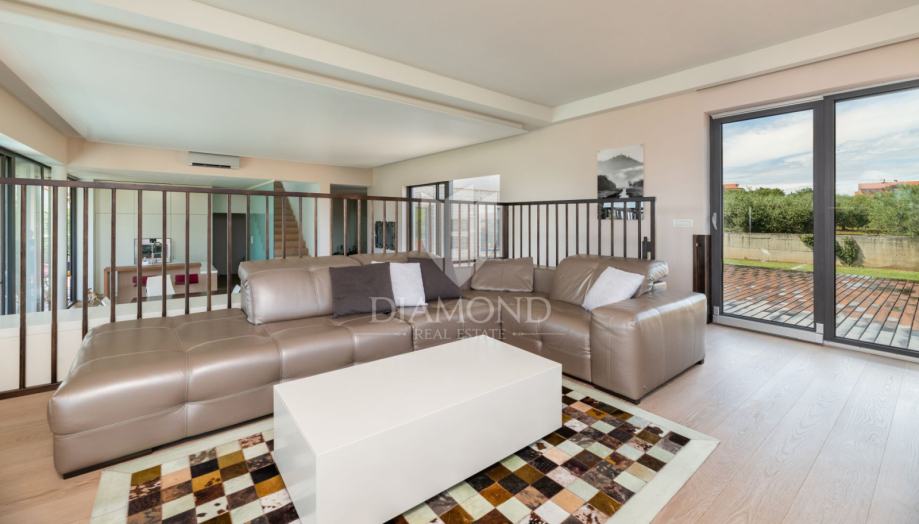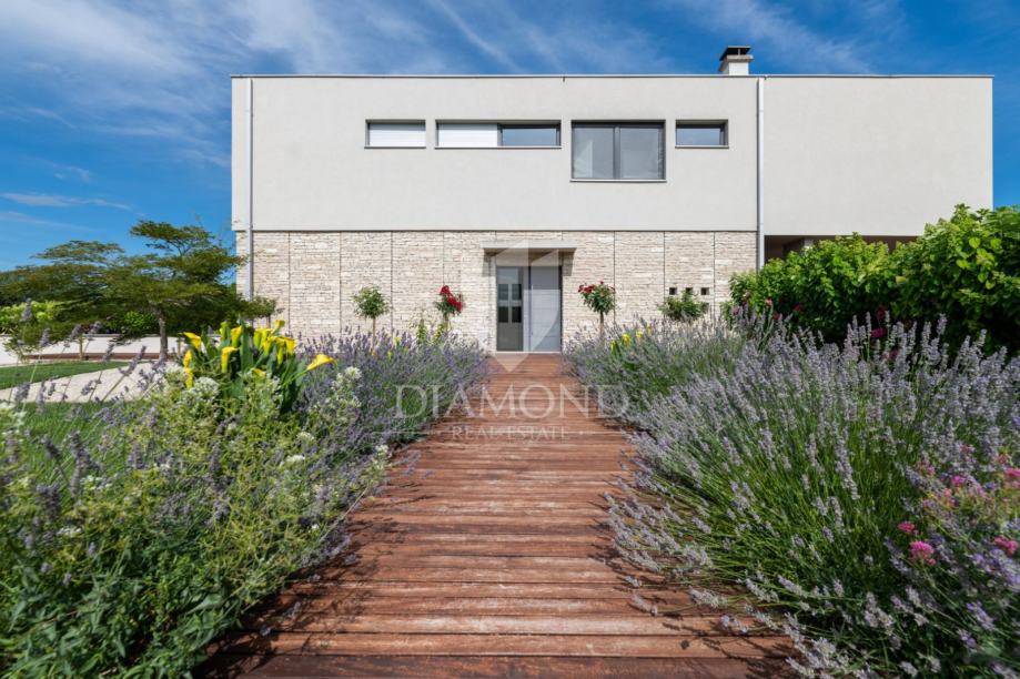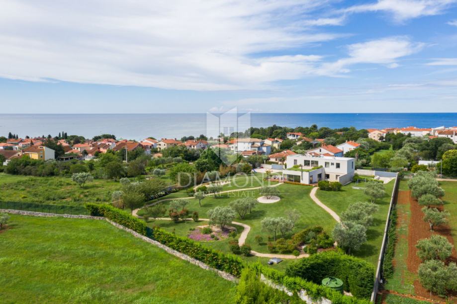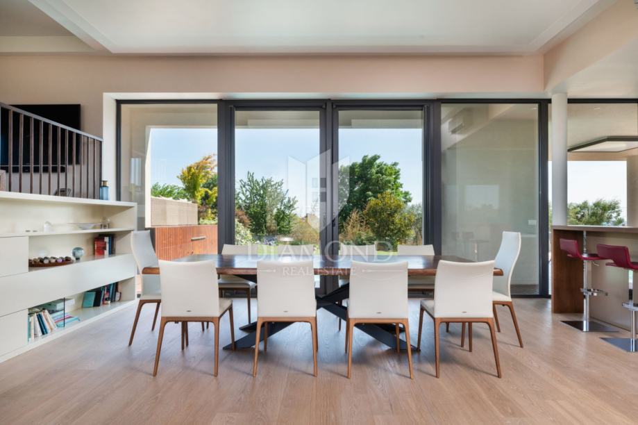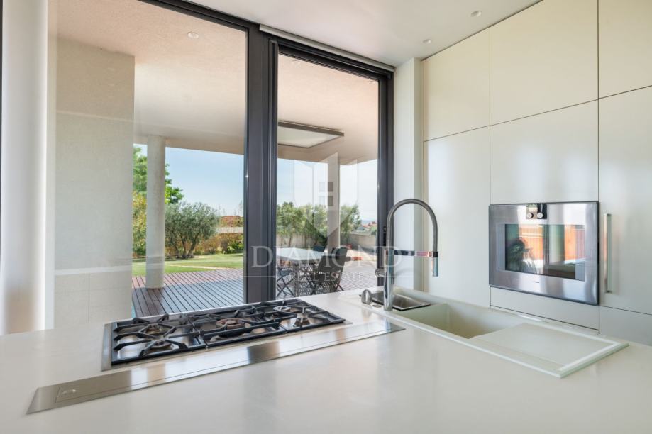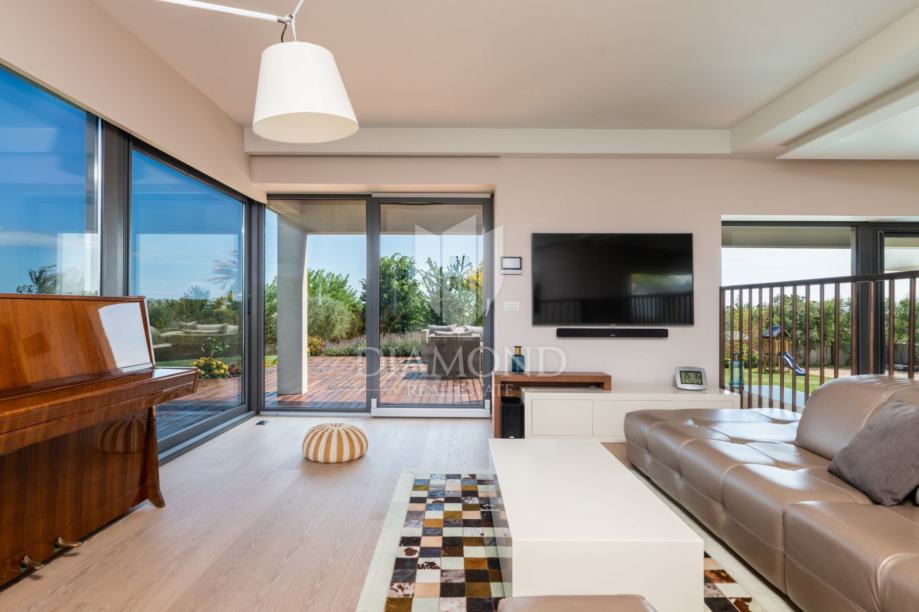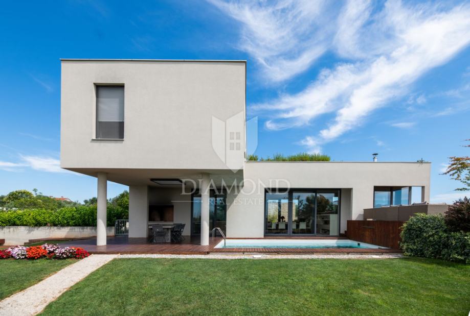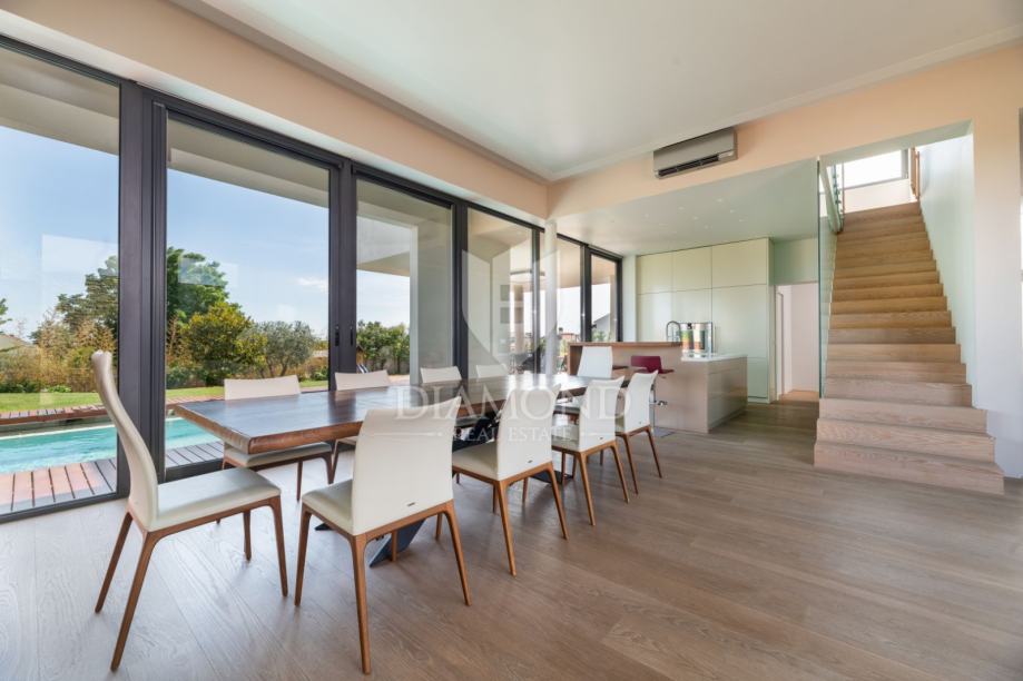 Prodaje se moderno dizajnirana i kvalitetno opremljena villa sa velikom okućnicom i prekrasnim pogledom na more nedaleko od Umaga.