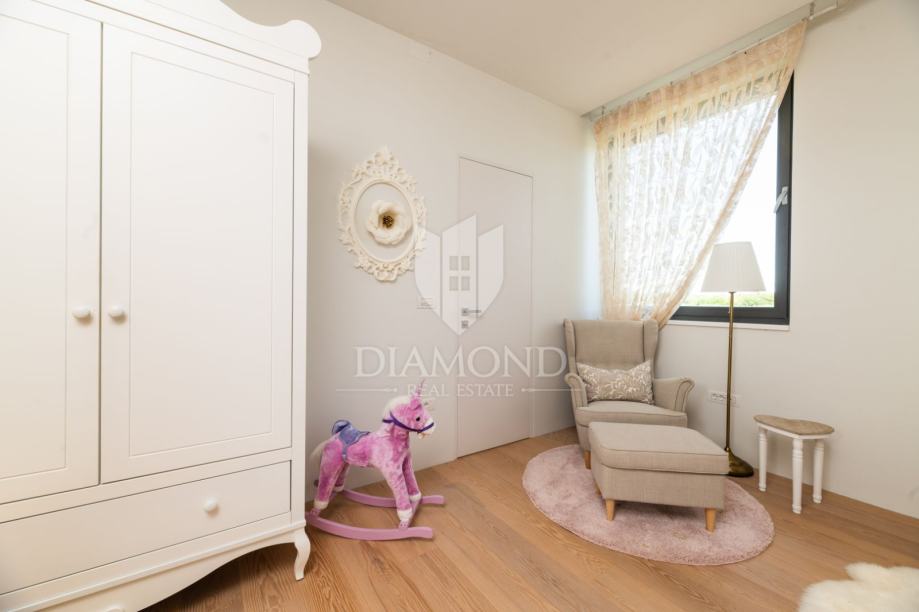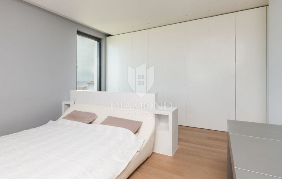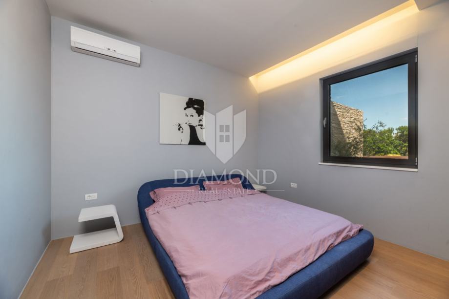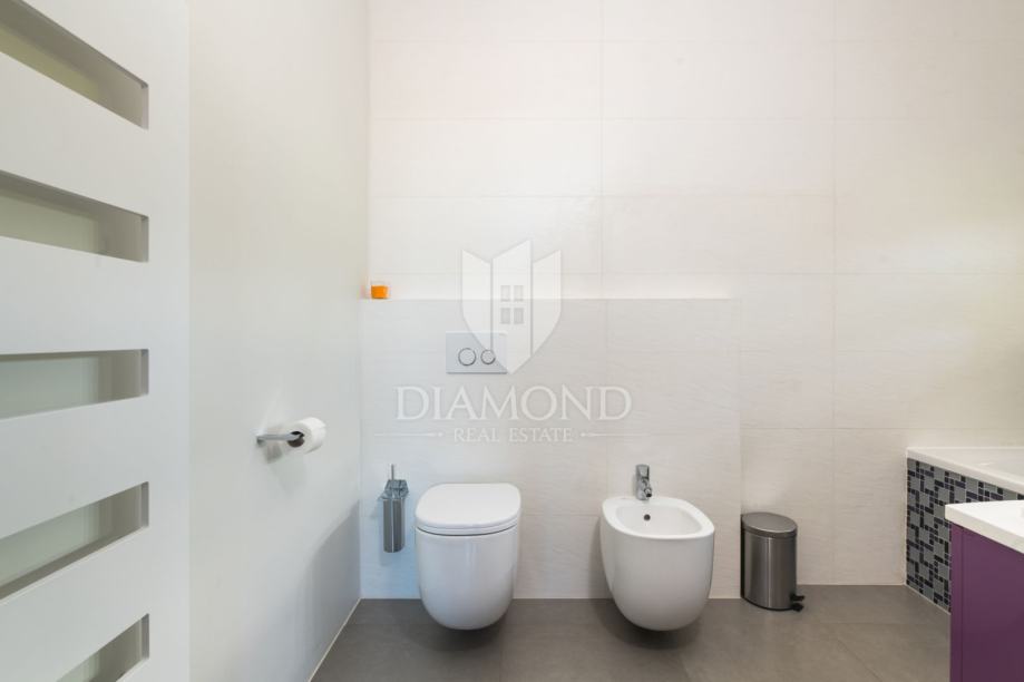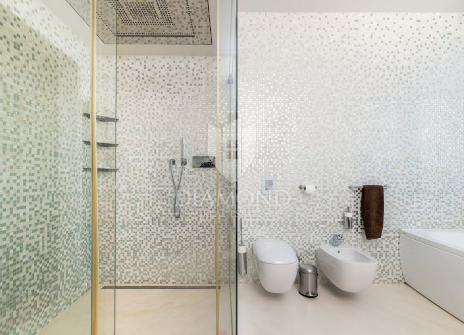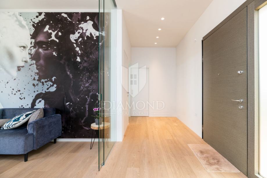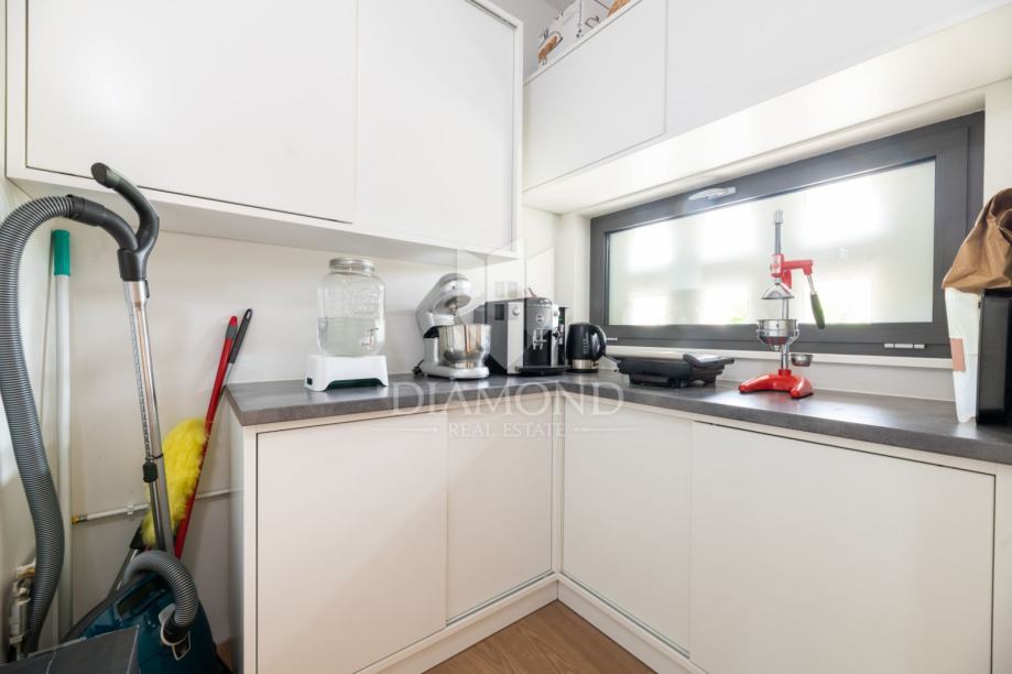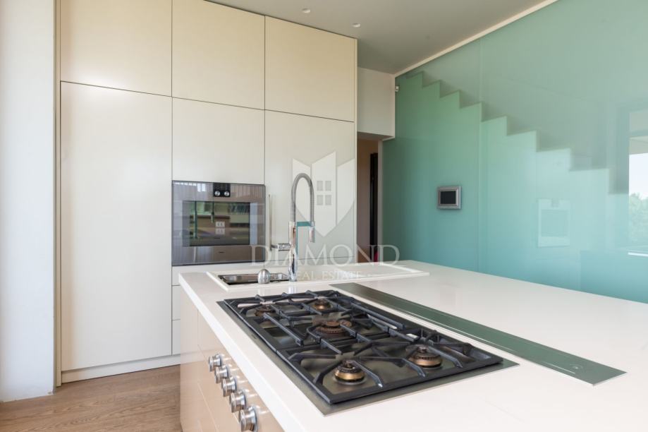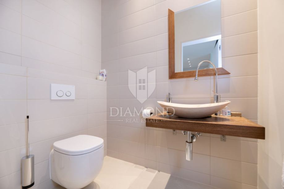 Villa je površine 500m2, a prostire se na podrum, prizemlje i kat. U prizemlju se nalazi prostrani dnevni boravak u kojem se nalazi i kamin, kvalitetno opremljena i otvoreno dizajnirana kuhinja i blagovaonica, hodnik, spavaća soba te kupaonica. Iz blagovaonice se izlazi na bazen pored koje se nalazi natkrivena terasa na kojoj se nalazi i grill te je idealna za uživanje u ljetnim mjesecima. Bazen ima i mogućnost grijanja. Stepenice vode na kat, na kojem se nalaze 3 spavaće sobe od kojih svaka ima vlastitu kupaonicu opremljenu kvalitetnom sanitarijom. Na katu se nalazi i prostrana krovna terasa sa koje se pruža predivan pogled na more. Na krovnoj terasi postoji mogućnost ugradnje jacuzzija. U podrumu se nalazi privatno kino sa projektorom, platnom i ozvučenjem te prostor za druženje. U podrumu je smještena i kotlovnica te garaža sa prostorom za više parkirnih mjesta. Villa ima i toplinsku pumpu, a grije se pomoću podnog grijanja, klima uređaja i kamina. Podno grijanje se može kontrolirati pomoću mobilne aplikacije.