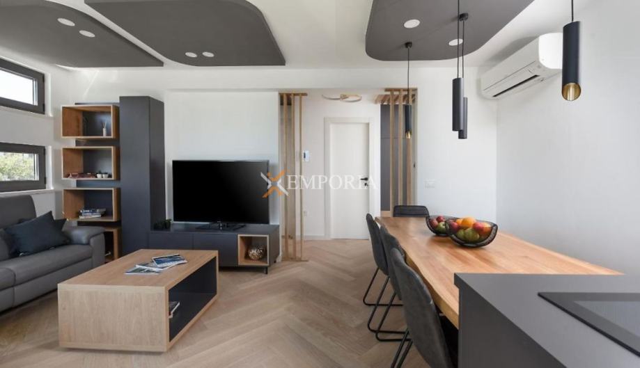 Kupac ne plaća porez na promet nekretnina.OpremaStan se prodaje potpuno namješten. Opremljen je podnim električnim grijanjem u svim prostorima osim spavaćih soba, dok je klimatizacija postavljena u dnevnom boravku. Građen je betonskim zidovima, a ugrađena aluminijska stolarija s troslojnim staklima, komarnicima i brisolejima pruža visoku energetsku učinkovitost. Fasada ima toplinsku izolaciju od 8 cm.