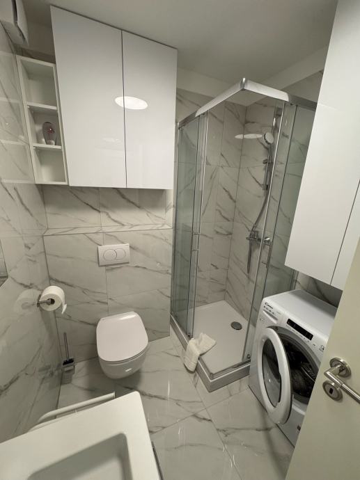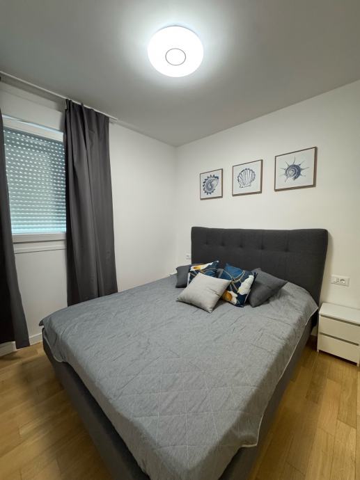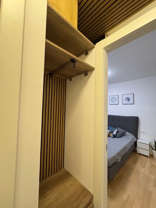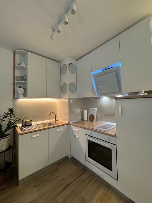 Stan je kompletno namješten i potpuno opremljen novim namještajem i aparatima. Sastoji se od kuhinje s dnevnim boravkom, spavaće sobe i kupaonice s kadom. Funkcionalan raspored i moderna oprema čine ga ugodnim za život.