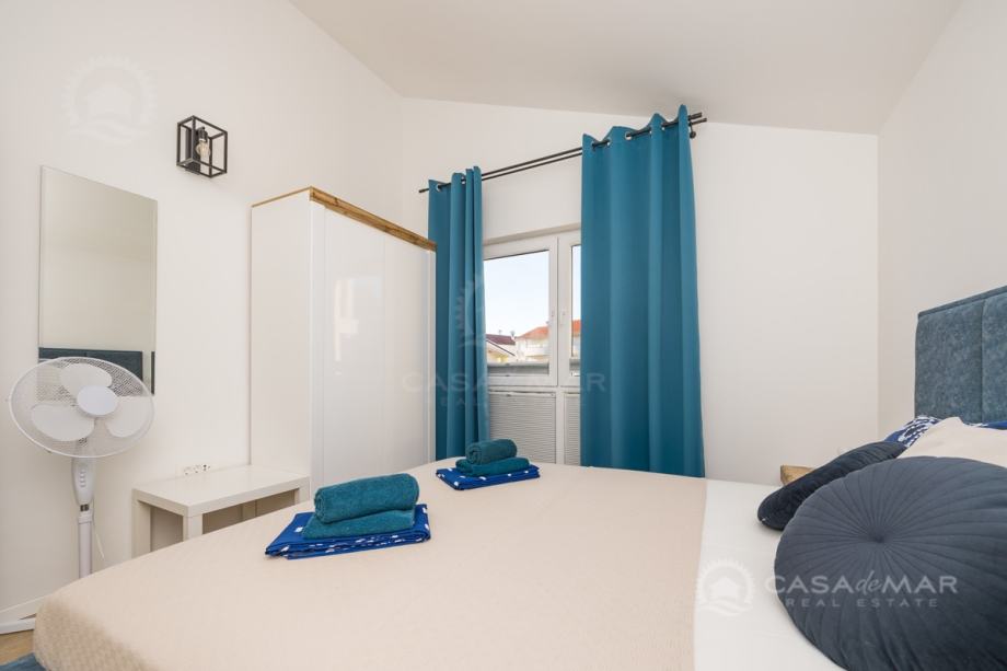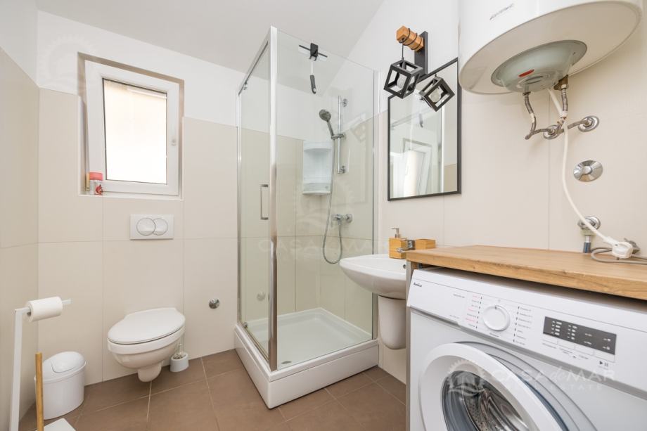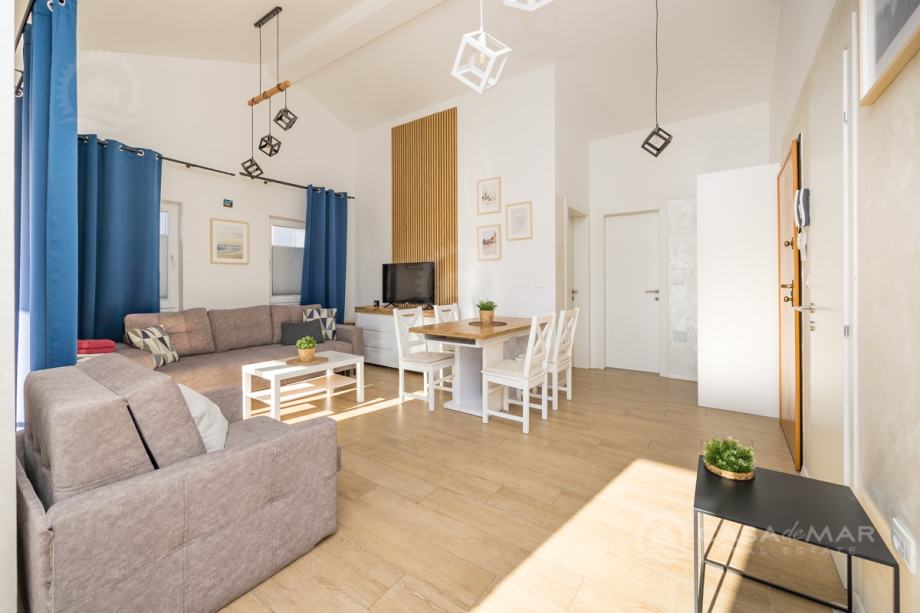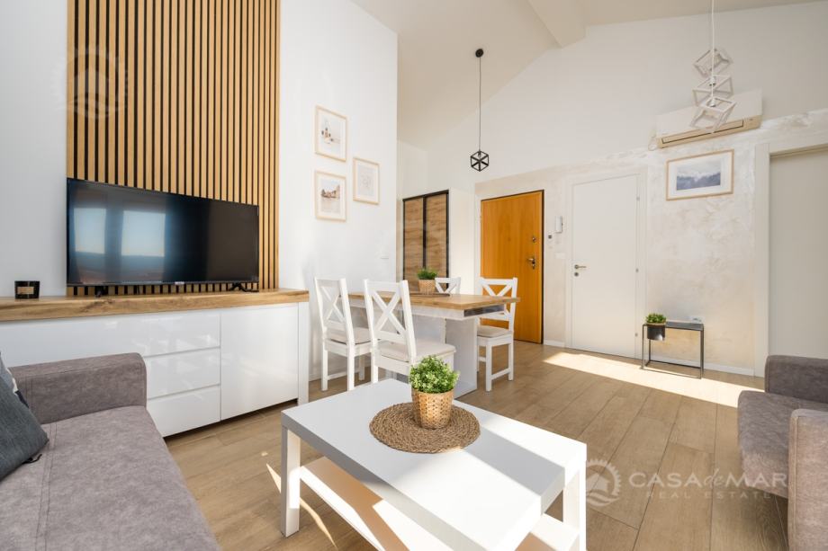 Apartman se nalazi na drugom katu stambene zgrade i ima ukupnu stambenu površinu od 58 m². Sastoji se od prostranog i svijetlog dnevnog boravka povezanog s kuhinjom i blagovaonicom, dvije udobne spavaće sobe, kupaonice te spremišta. Iz dnevnog boravka izlazi se na natkriveni balkon s pogledom na more, idealan za opuštanje i boravak na otvorenom tijekom cijele godine.