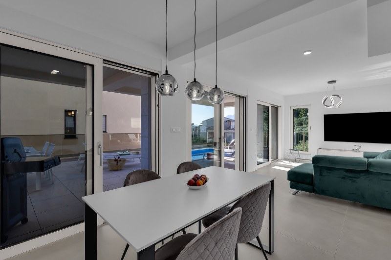 Stan je ukupne korisne površine 120,97m2, a sastoji se od hodnika, kuhinje i blagovaonice, dnevnog boravka, tri spavaće sobe, dvije kupaonice, Wc-a, lođe i južno orijentirane prostrane terase (72m2) na kojoj je ugrađen vanjski bazen sa roštiljem i obiteljskim stolom za druženje.