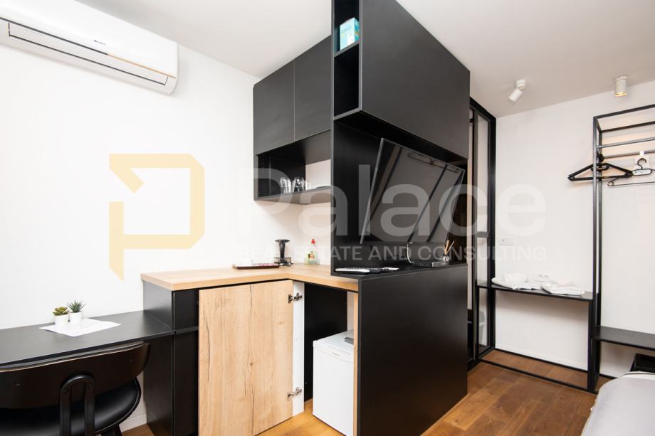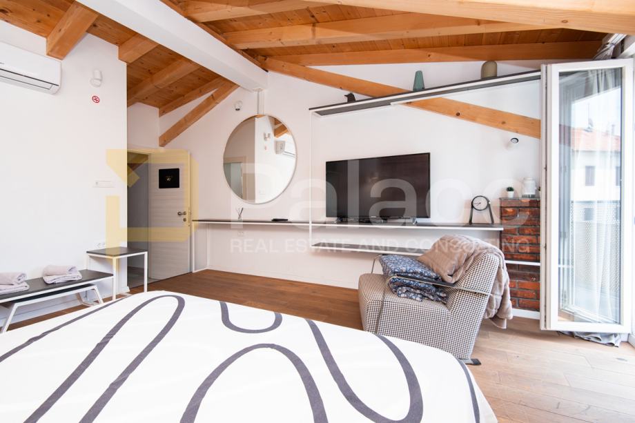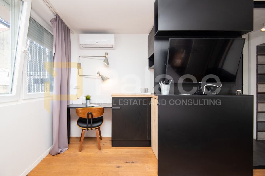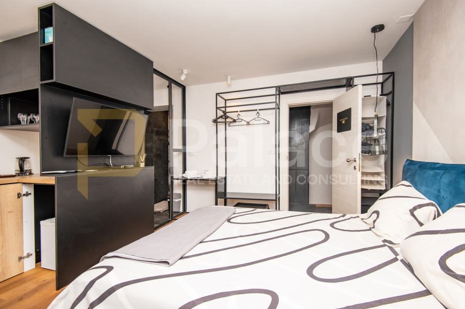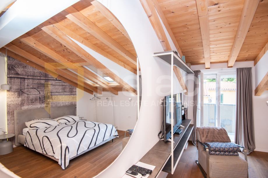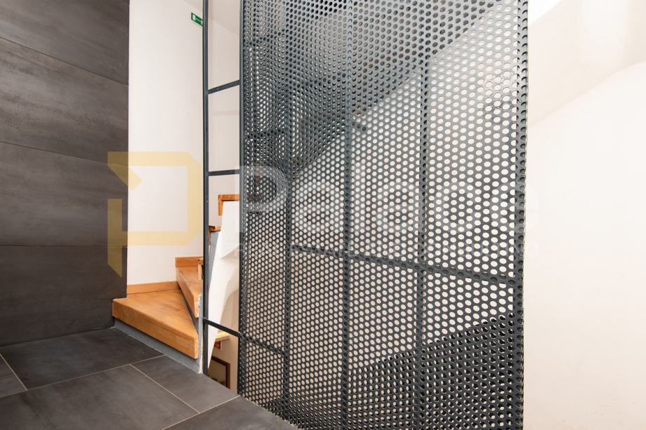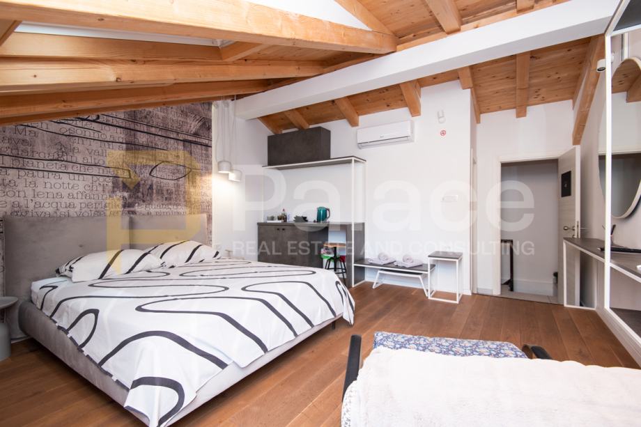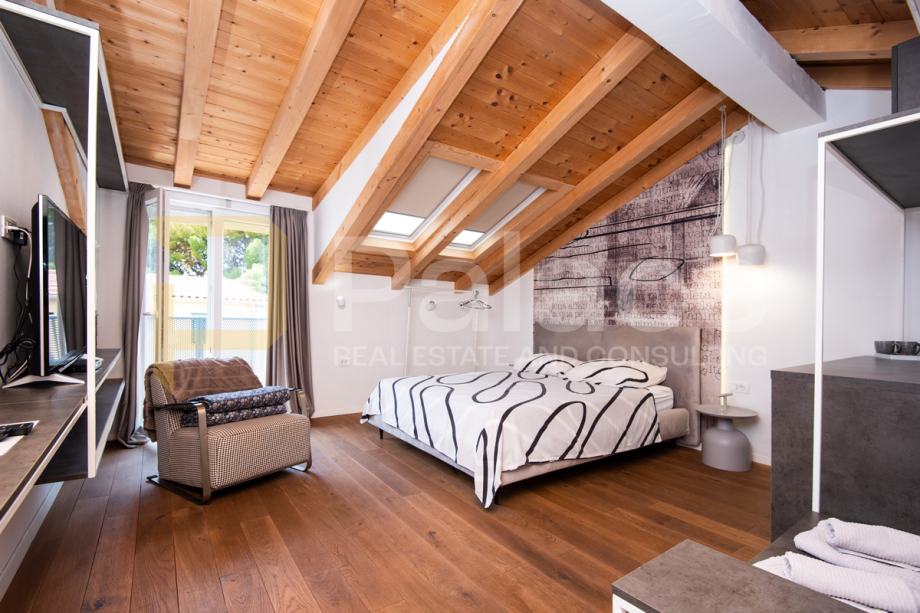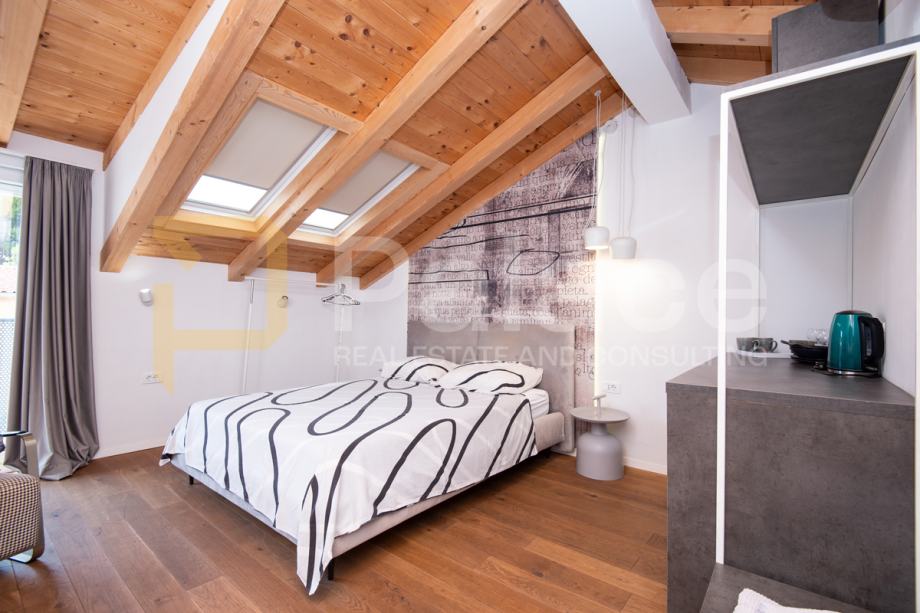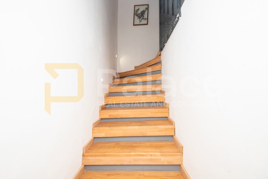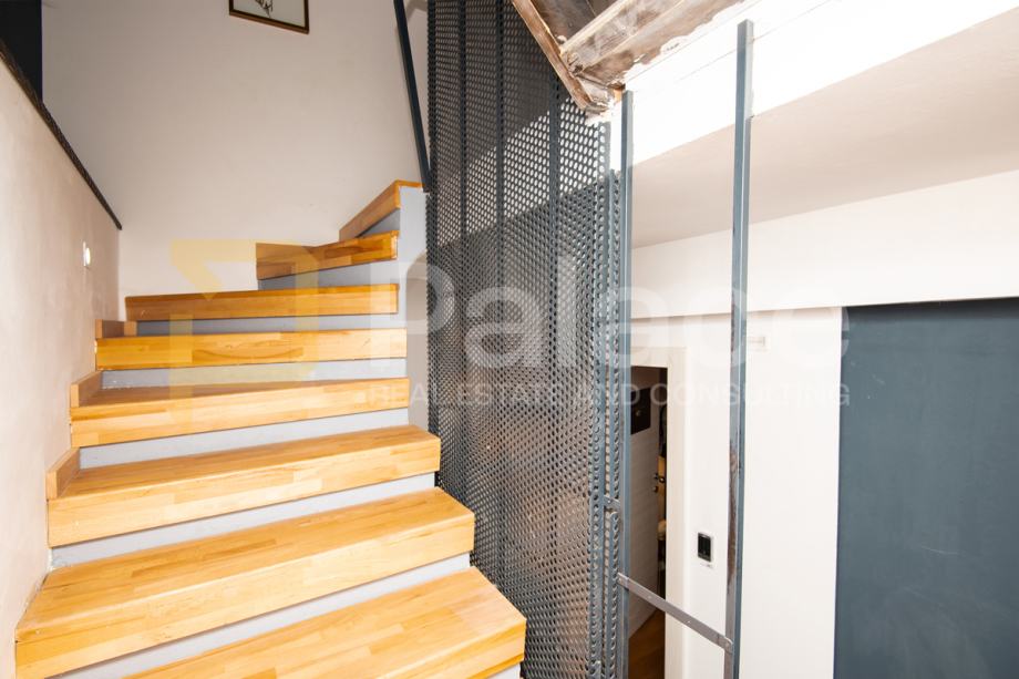 Prostire se na četiri etaže – prizemlje, dva kata i potkrovlje. U prizemlju se nalazi spavaća soba s vlastitom kupaonicom i prostor za vešeraj. Na gornjim etažama nalaze se moderno uređeni studio apartmani, svaki s vlastitom kupaonicom, klimom i balkonom. Instalacije za malu kuhinju već su provedene u svakom apartmanu, što omogućuje dodatnu prilagodbu prema željama budućeg vlasnika.