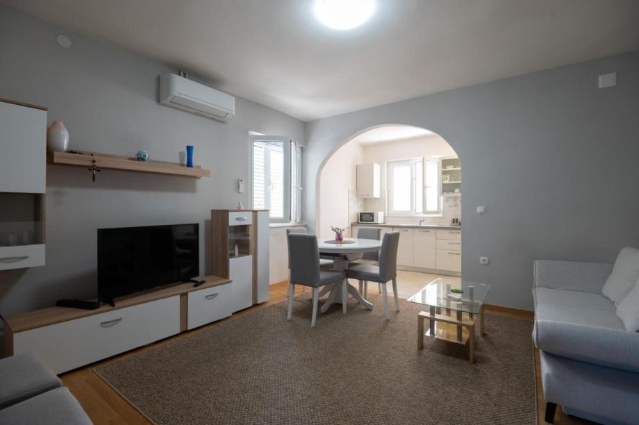 Na katu se nalazi komforan stan s neto površinom od 94m2. Stan se sastoji od kuhinje s blagovaonicom i dnevnim boravkom u otvorenom prostoru, kupaonice s wc-om, dva balkona i terase s ostavom.