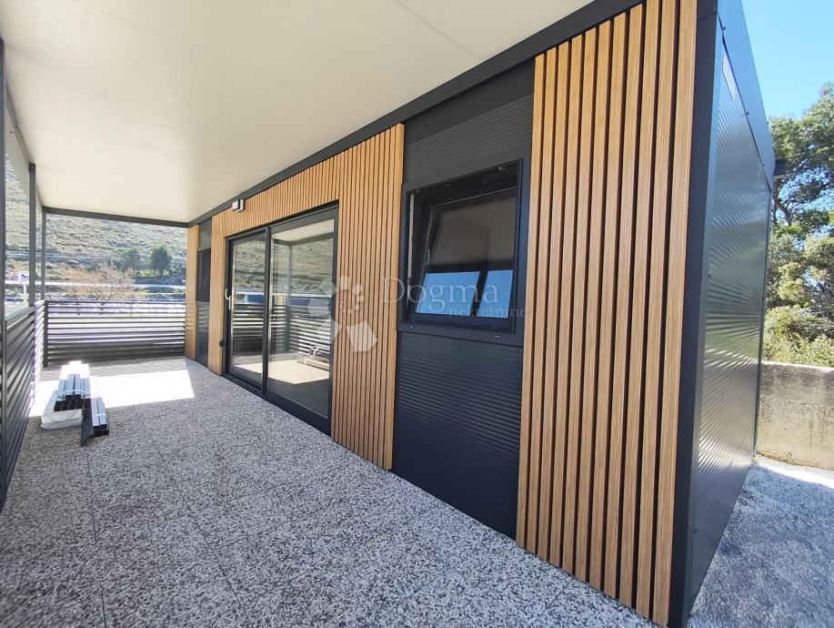 Ova optimalno namještena nekretnina ima i natkrivenu i opremljenu terasu veličine 24m2 koja je zamišljena kao produžetak dnevnog boravka na otvorenom. Na terasi se nalazi veliki stol sa 6 stolica, ležaljkom sa pomoćnim stolićem i baldahinima, koji pružaju intimu i štite od popodnevnog sunca. Iz spavaće sobe i terase imate predivan otvoreni pogled na more. Osim plaže, tu je i manji betonski mol, gdje možete vezati svoju brodicu ili vodni skuter.