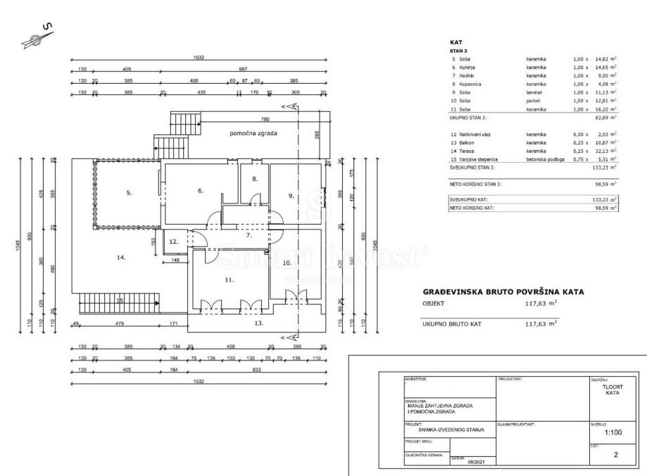 Na prvom katu je uređeni stambeni prostor, u naravi trosobni stan sa dnevnim boravkom, kuhinjom i kupaonicom, ukupne površine 83 m2, balkon od 10 m2 i velika terasa od 30 m2. Sve ukupno 123 m2.