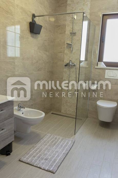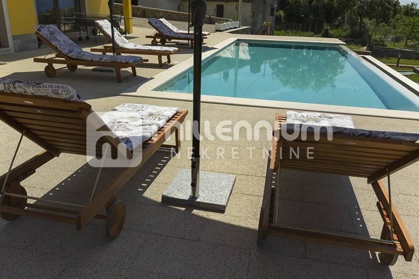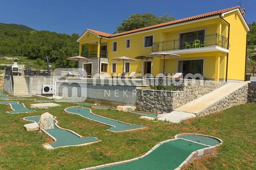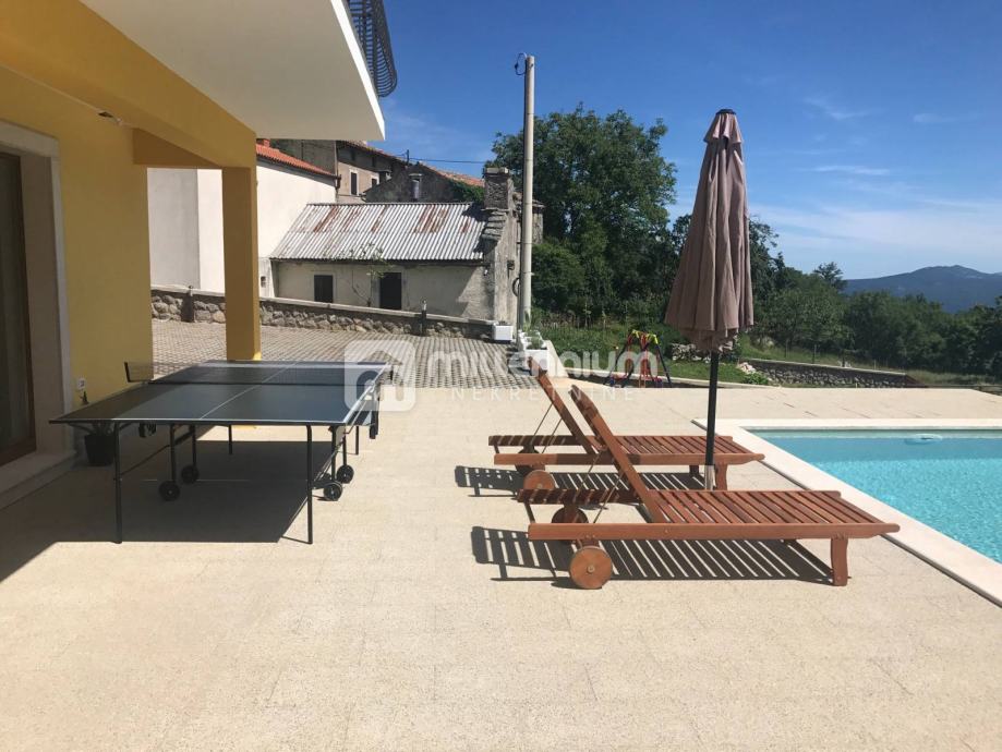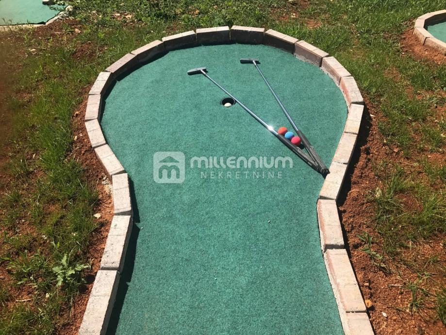 Okružena je s 800m2 velikom okućnicom na kojoj se nalaze terasa, sunčalište, bazen, mini golf, parkirni prostor i travnate površine.
