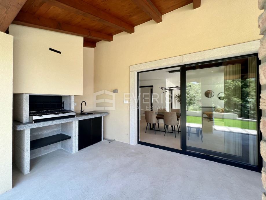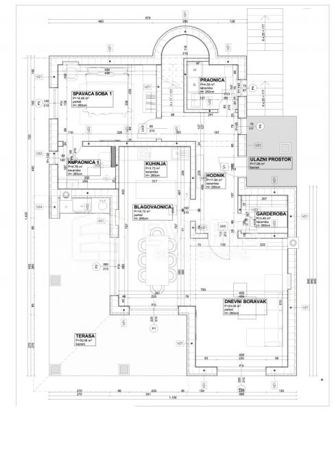 * Dnevnog boravka, kuhinje i blagovaone povezanih u cjelinu iz koje se izlazi na predivnu natkrivenu terasu (30m2) sa ljetnom kuhinjom i roštiljem