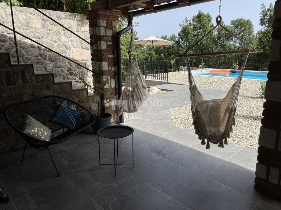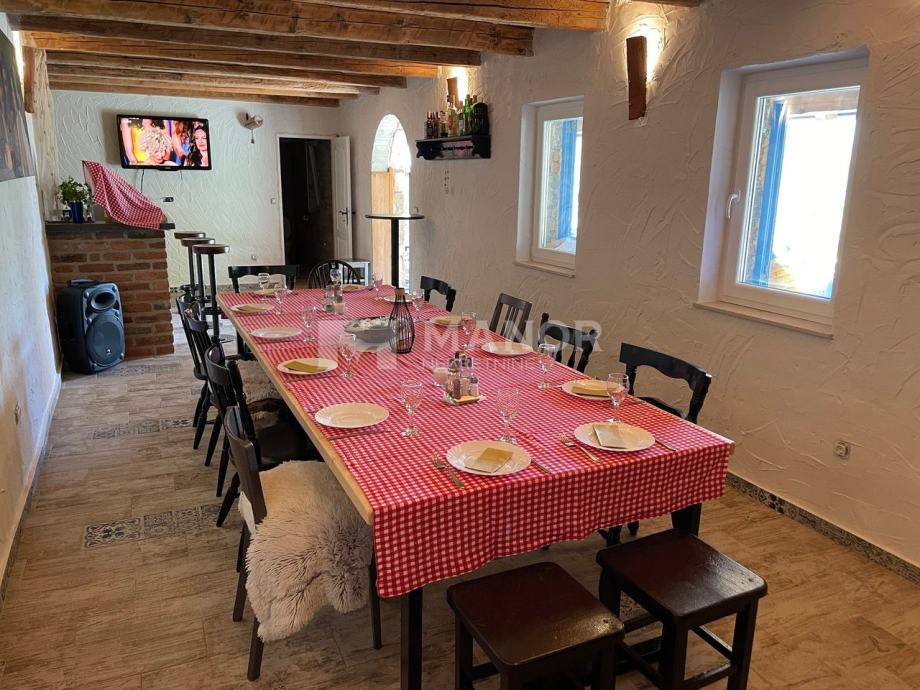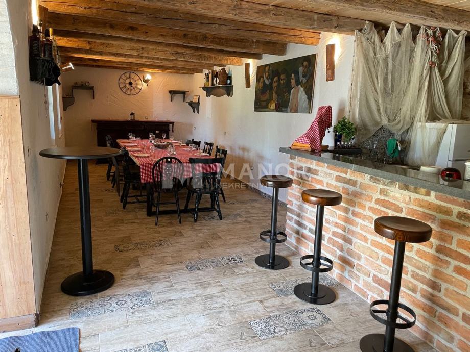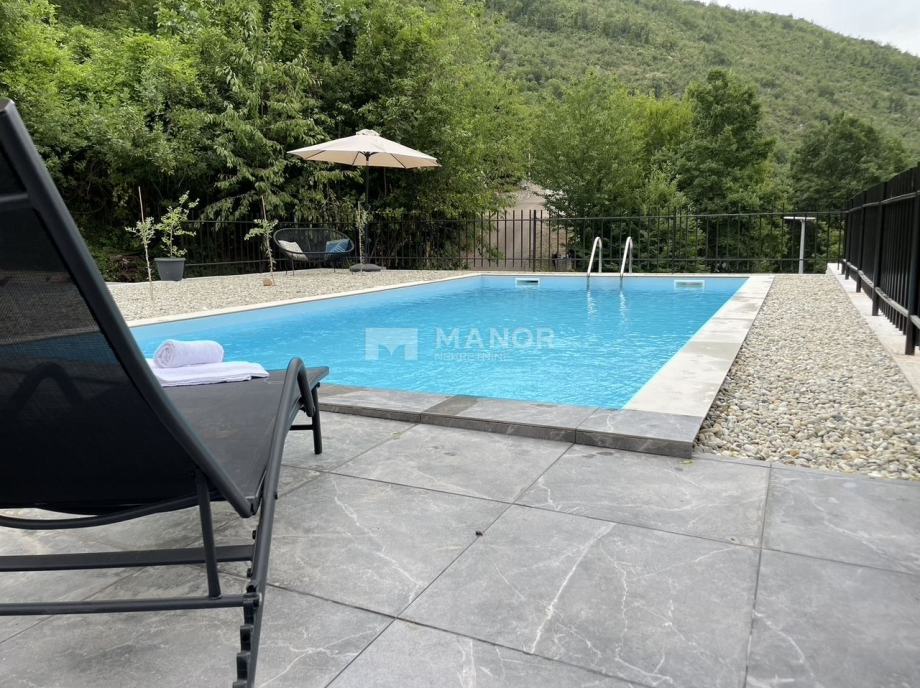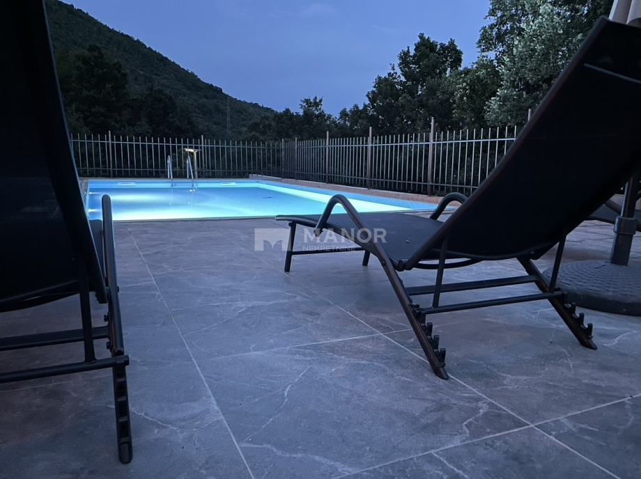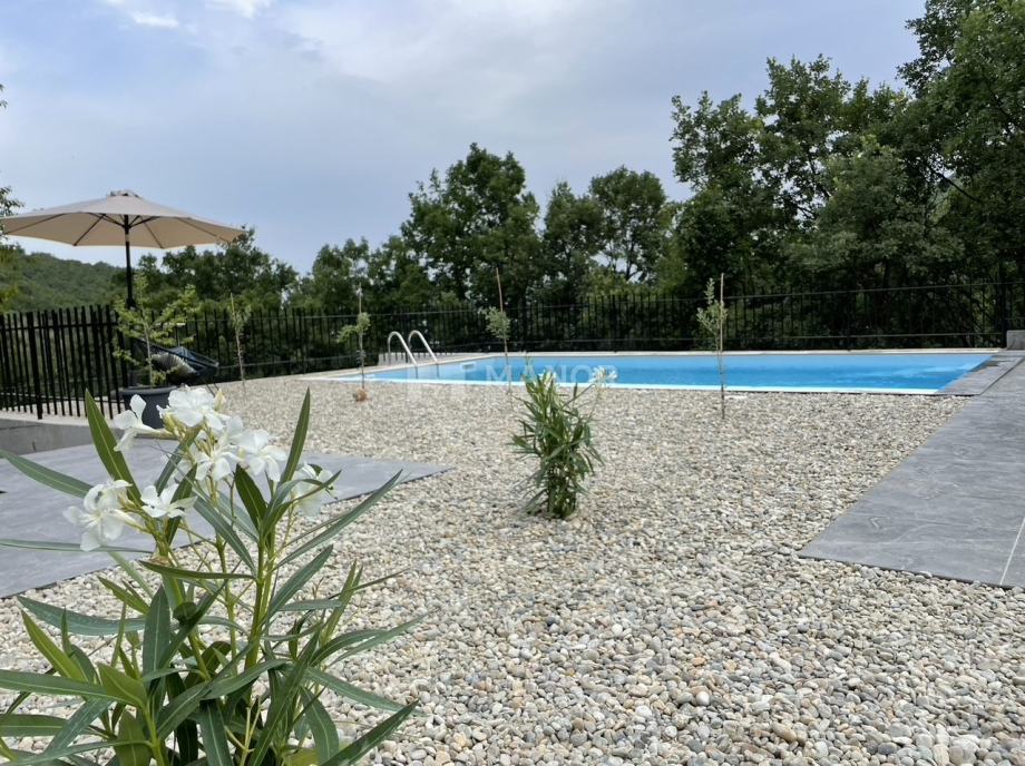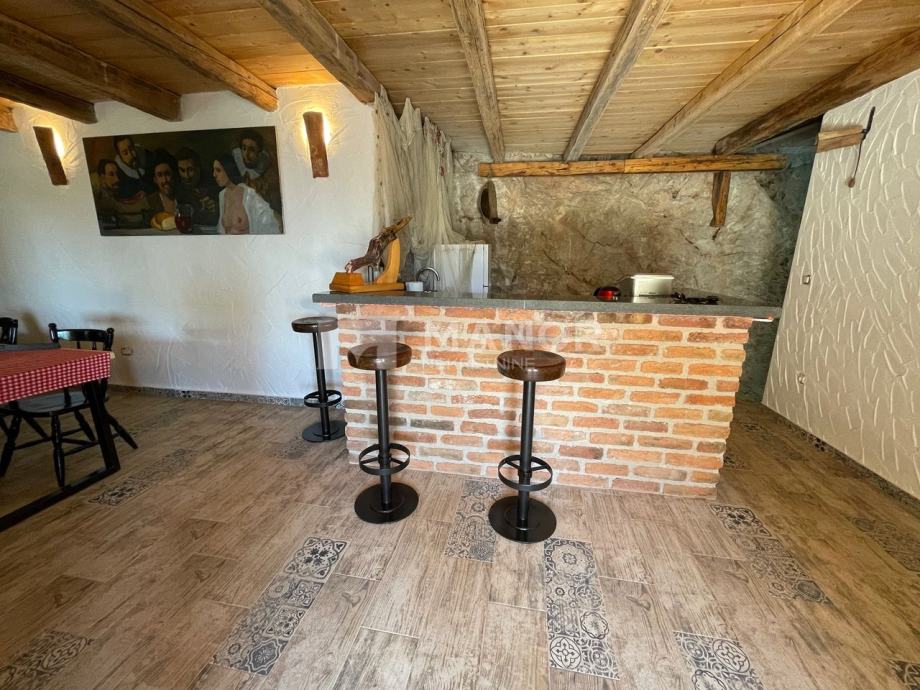 Prizemlje se sastoji od velike konobe s kaminom i wc-om, bazena (8x4) s automatskom pumpom, sunčalište i terasa s koje se pruža predivan pogled na prirodu.