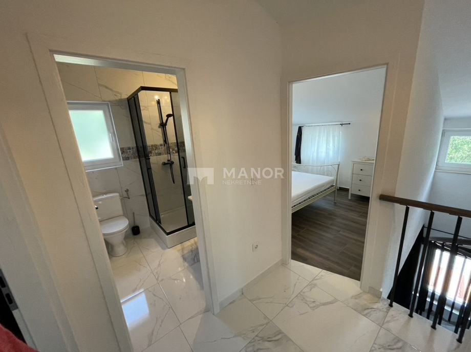 Kući pripada i okućnica površine 1400 m2 a nalazi se na mirnoj i pristupačnoj lokaciji s prekrasnim pogledom. Udaljena 1 km od mora/plaže te svih potrebnih sadržaja.