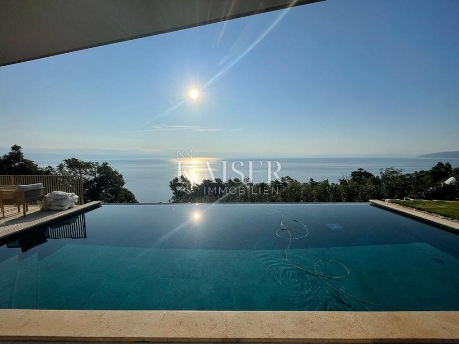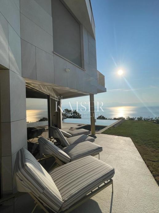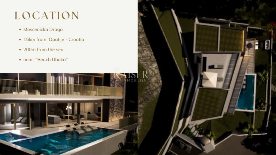 Vila ima šest prostranih spavaćih soba sa šest vlastitih kupaonica. Vila pruža vlasnicima potpunu privatnost i mir. Na prodaju je prekrasna moderna vila s infinity bazenom i panoramskim pogledom na more, na lijepoj i mirnoj lokaciji i samo 5 minuta vožnje udaljenoj od mora i najljepših plaža u Mošćeničkoj Dragi.