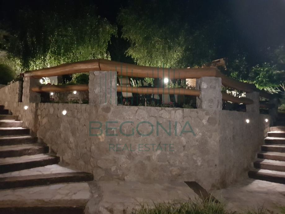 Restoran obuhvaća:- Prostranu salu s 40 registriranih mjesta, s mogućnošću proširenja na 60 mjesta- Veliki kamin za pripremu tradicionalnih jela- Potpuno opremljenu kuhinju- Toalete za goste- Podrumski prostor od 60 m2- Prostrane terase za goste