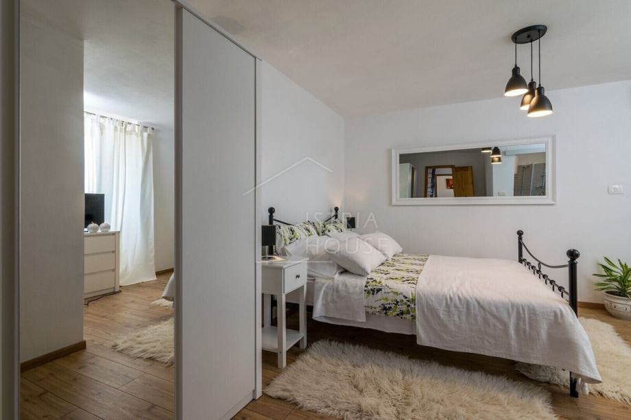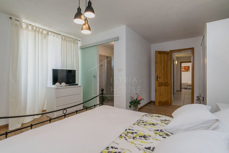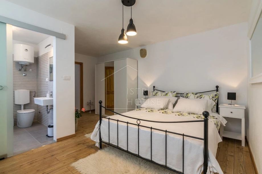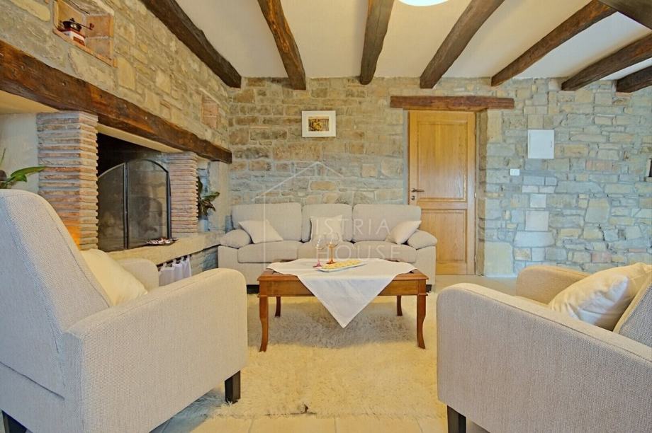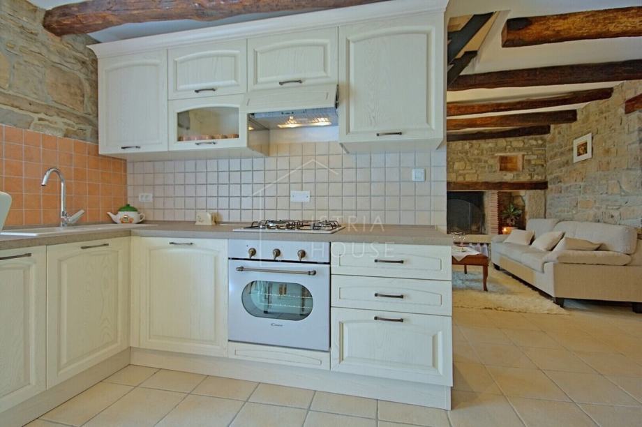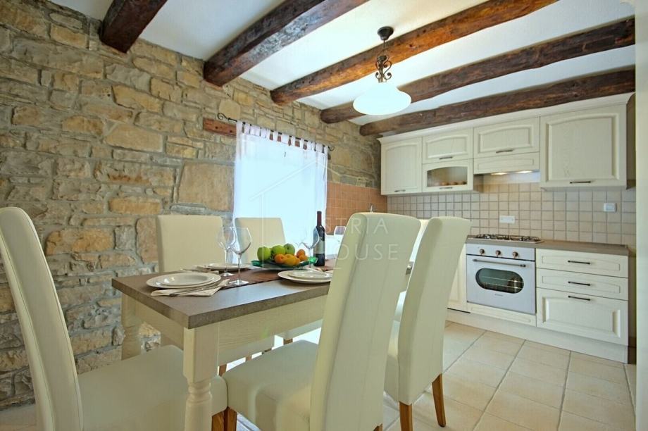 Kuća je samostojeća, autohtona i kamena, a sastoji se od šarmantnog dnevnog boravka s kuhinjom gdje je maksimalno sačuvan istarski kameni stil, tri spavaće sobe pri čemu svaka soba ima svoje kupatilo. Iz dnevnog boravka se izlazi na prekrasnu terasu sa koje se pruža panoramski pogled na Motovun. Kuća ima i veliku ostavu koja se može preurediti u dodatnu spavaću sobu ili prostor za druženje.