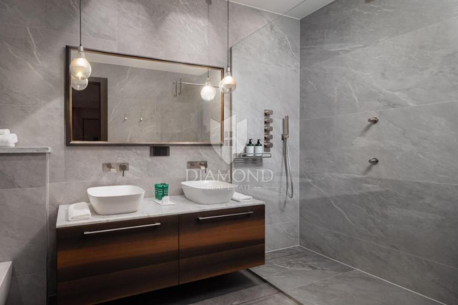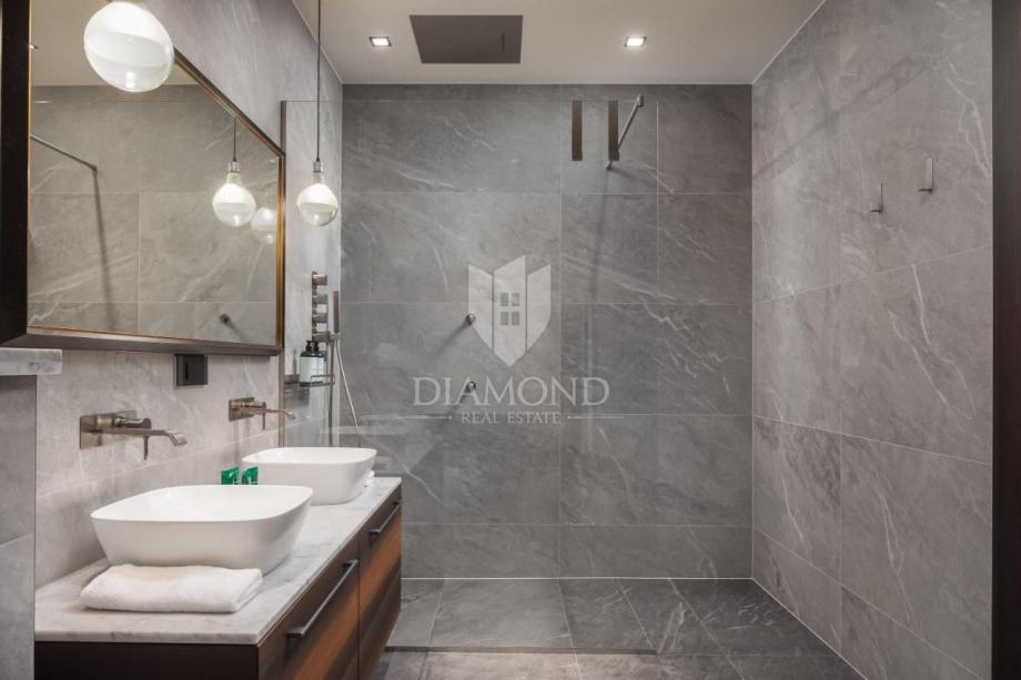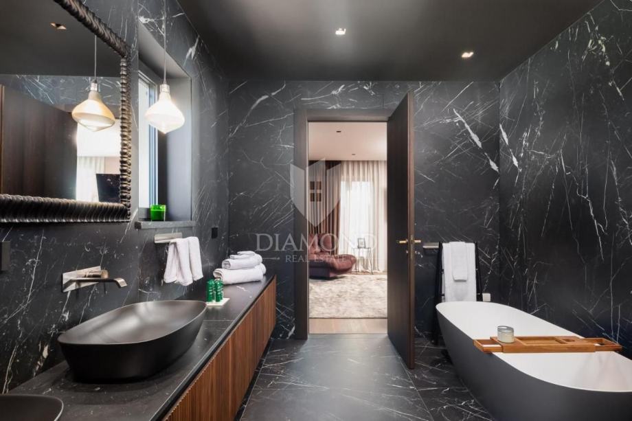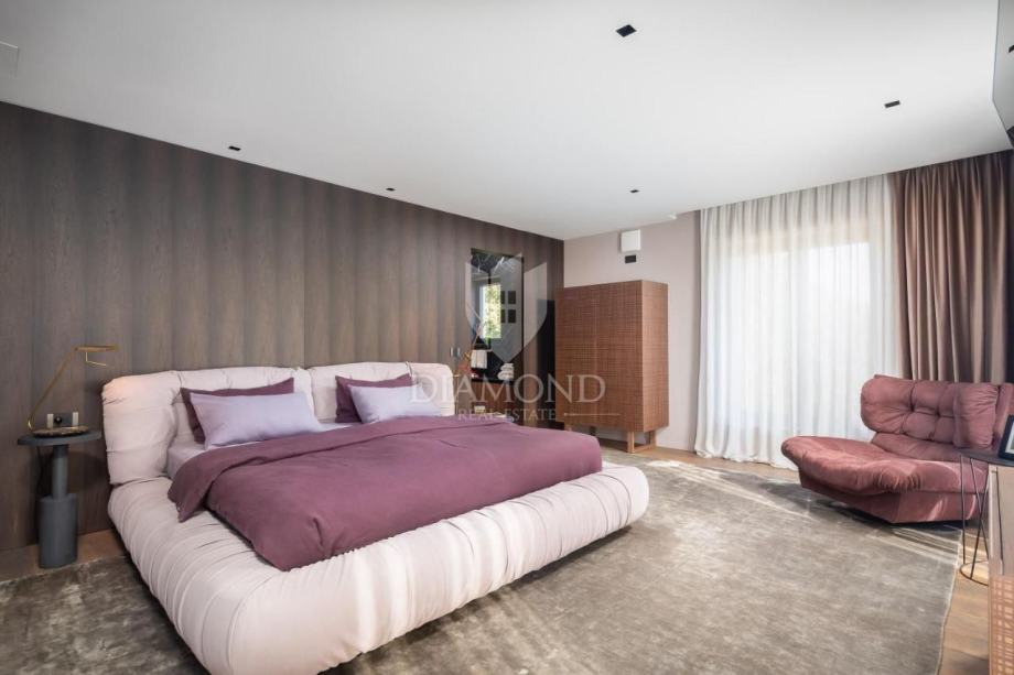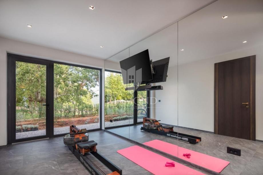 Na katu se nalaze profinjene spavaće sobe s privatnim kupaonicama, dok glavna spavaća soba nudi intimnu spa-oazu s garderobom i samostojećom kadom. Vila ima i fitness zonu s ogledalima u punoj visini, kao i prostranu praonicu i ostavu.