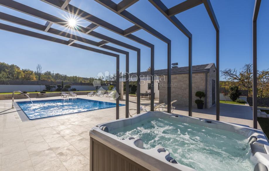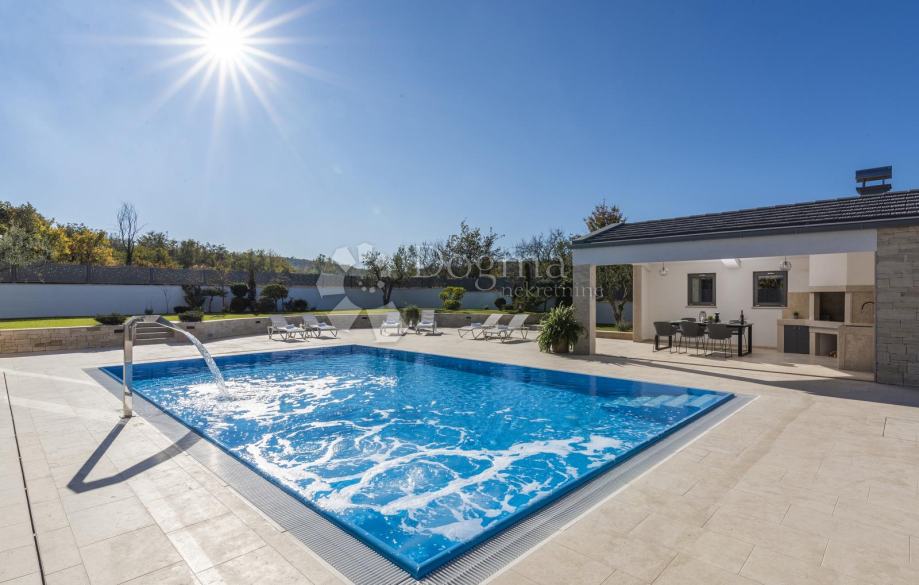 Na uređenoj okućnici nalazi se preljevni bazen površine 60m2 (sustavom za samo čišćenje i automatsku kontrolu kvalitete vode, te podvodnim masažnim funkcijama) natkriveni Jacuzzi, vrtna kuhinja s roštiljem, dječje igralište sa gumenom podlogom za zaštitu od ozljeda, vanjsko zatvoreno spremište 4×4 m2, te mjesto za 4 natkrivena parkirna mjesta.