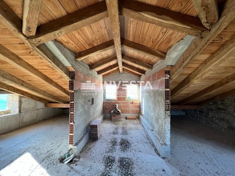 Kuća je u roh bau fazi, ukupne je površine 240 m2 te se proteže kroz tri etaže: prizemlje, kat i visoko potkrovlje.