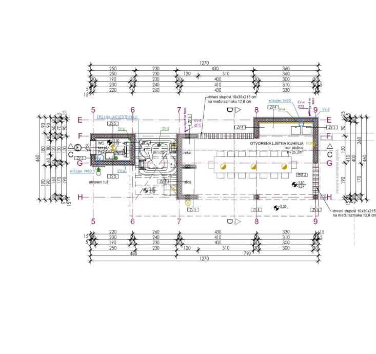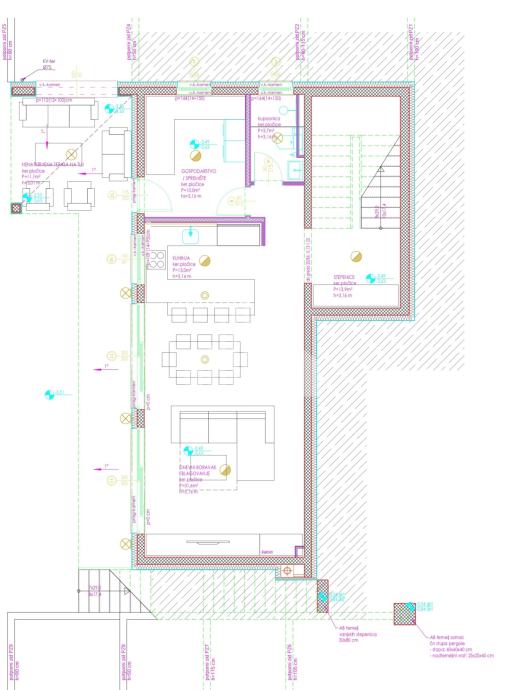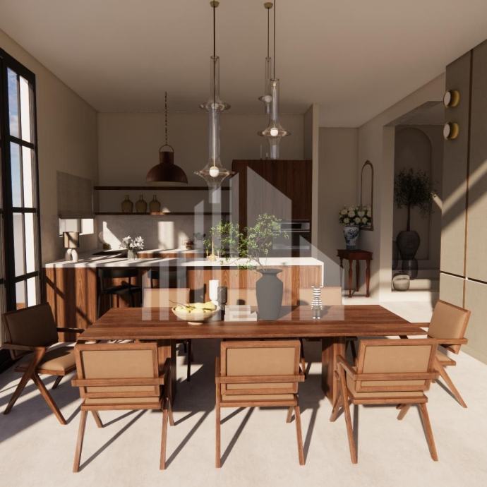 Donja etaža dizajnirana je kao otvoreni prostor koji obuhvaća kuhinju, blagovaonicu i dnevni boravak. Iz ovog prostora izlazi se direktno na prostrano dvorište, gdje se nalaze bazen, sunčalište i ljetna kuhinja. Gostinjska kupaonica i veliko spremište, koje djeluje i kao tehnička prostorija, također su smješteni na ovoj etaži. Posebna pažnja posvećena je kombinaciji suvremenog dizajna s autentičnom tradicijom lokalnog područja, korištenjem prirodnih materijala i tekstura kako bi se postigao topao i ugodan ambijent.
