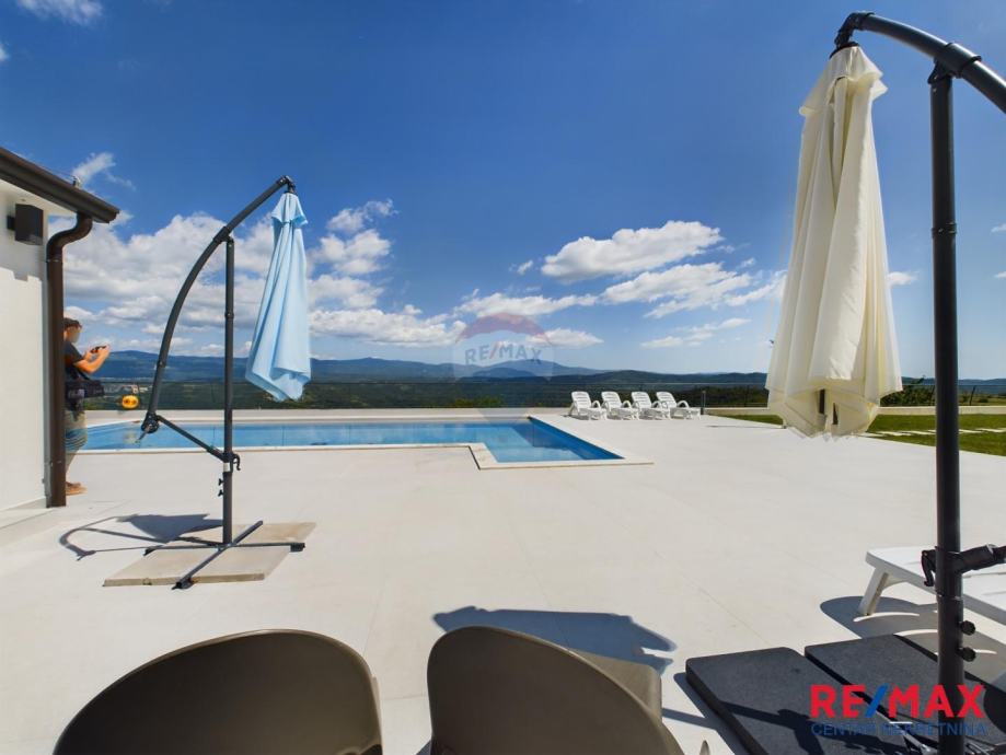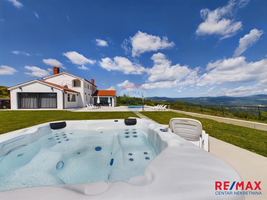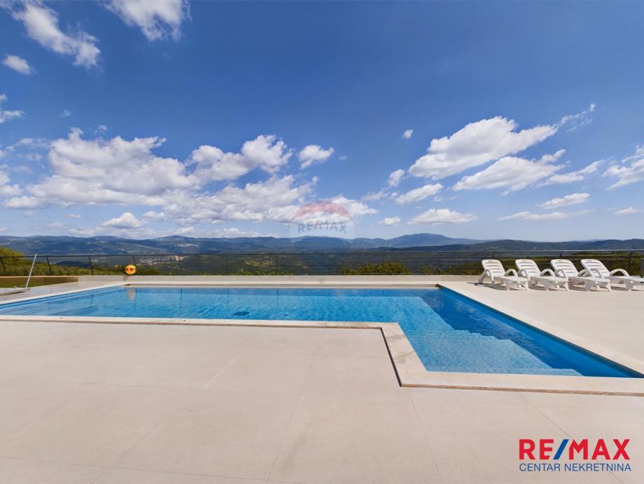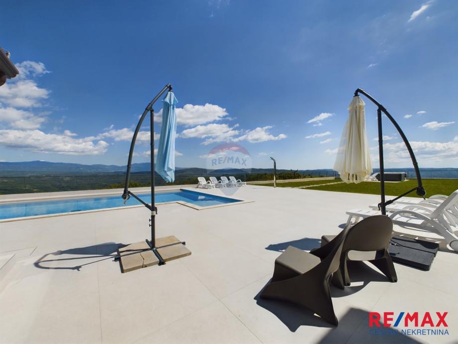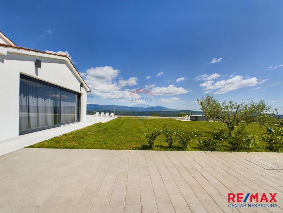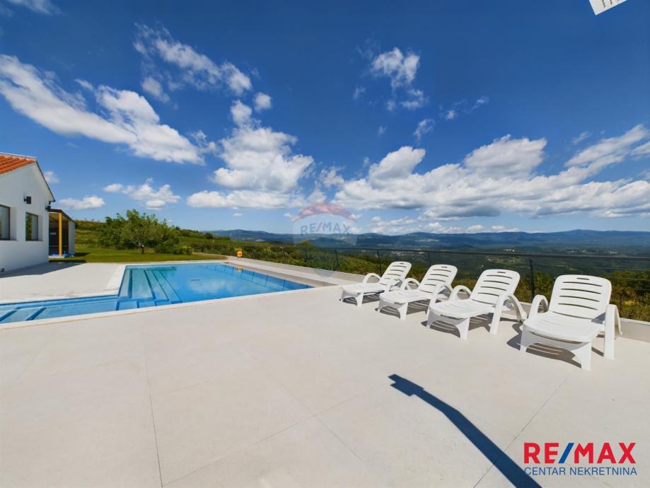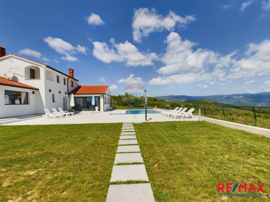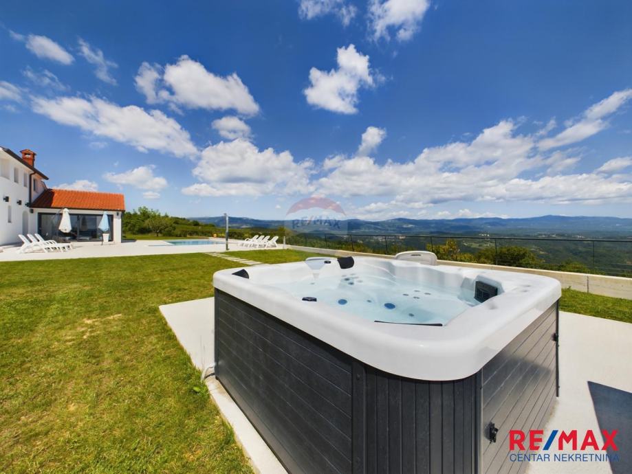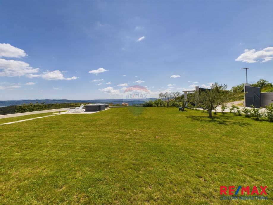 Na pola puta između Motovuna i Buzeta, na samom vrhu brežuljka smještena je ova moderna vila na 3300m2 okućnice. Iz same kuće pruža se impresivni pogled na istarski krajolik, Učku i Ćićariju. Okućnica je pomno uređena, na njoj nalazimo veliki bazen, hidromasažnu kadu i ljetnu kuhinju. Kuća je moderno uređena sa velikom pažnjom na detalje. Sastoji se od kuhinje, blagavaone i dnevnog boravka u open space konceptu. U prizemlju se još nalazi jedna kupaona, spavaća soba i fitness. Na katu se nalaze još dvije sobe, svaka sa svojom kupaonicom.
