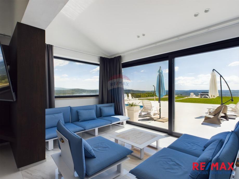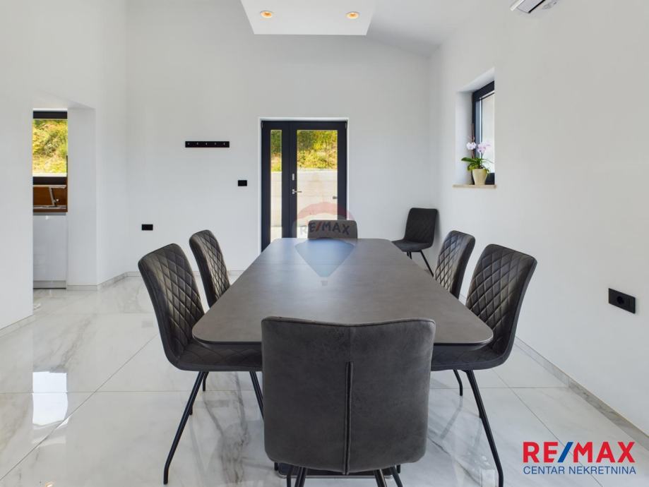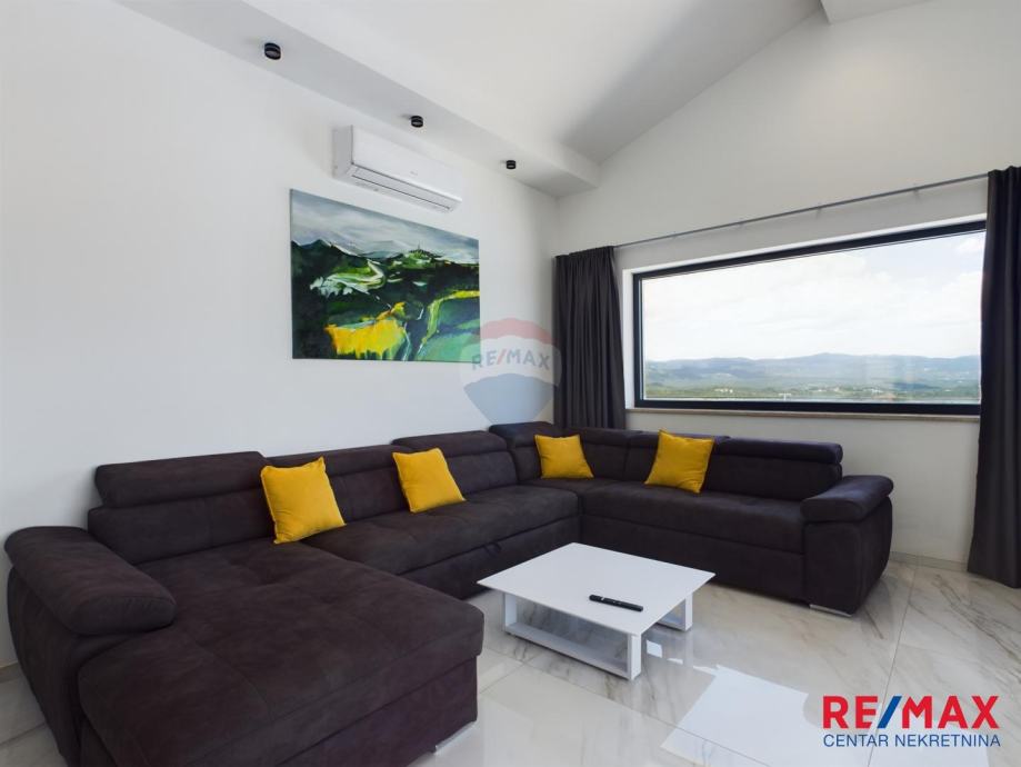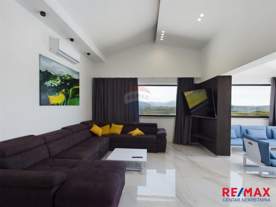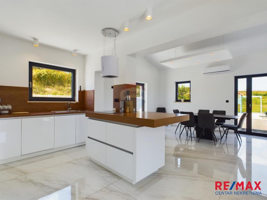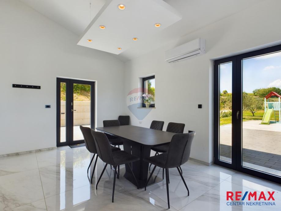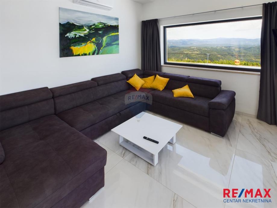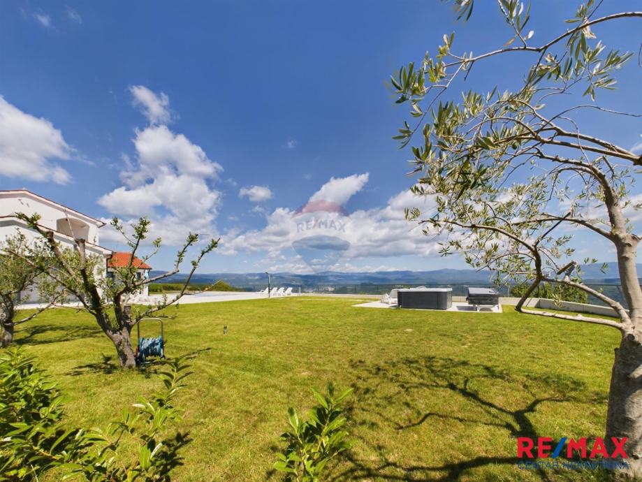 Na pola puta između Motovuna i Buzeta, na samom vrhu brežuljka smještena je ova moderna vila na 3300m2 okućnice. Iz same kuće pruža se impresivni pogled na istarski krajolik, Učku i Ćićariju. Okućnica je pomno uređena, na njoj nalazimo veliki bazen, hidromasažnu kadu i ljetnu kuhinju. Kuća je moderno uređena sa velikom pažnjom na detalje. Sastoji se od kuhinje, blagavaone i dnevnog boravka u open space konceptu. U prizemlju se još nalazi jedna kupaona, spavaća soba i fitness. Na katu se nalaze još dvije sobe, svaka sa svojom kupaonicom.