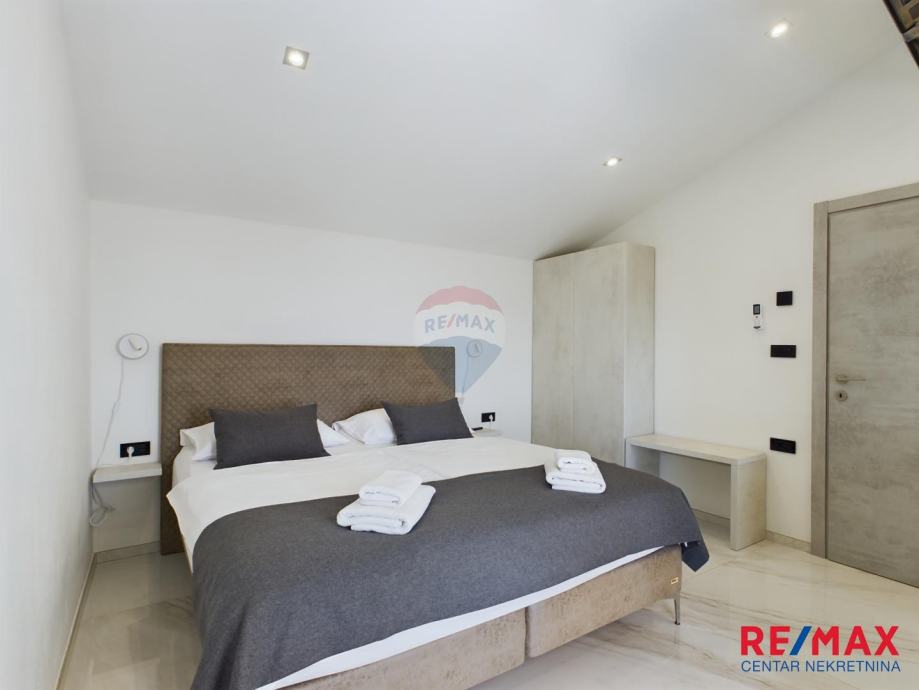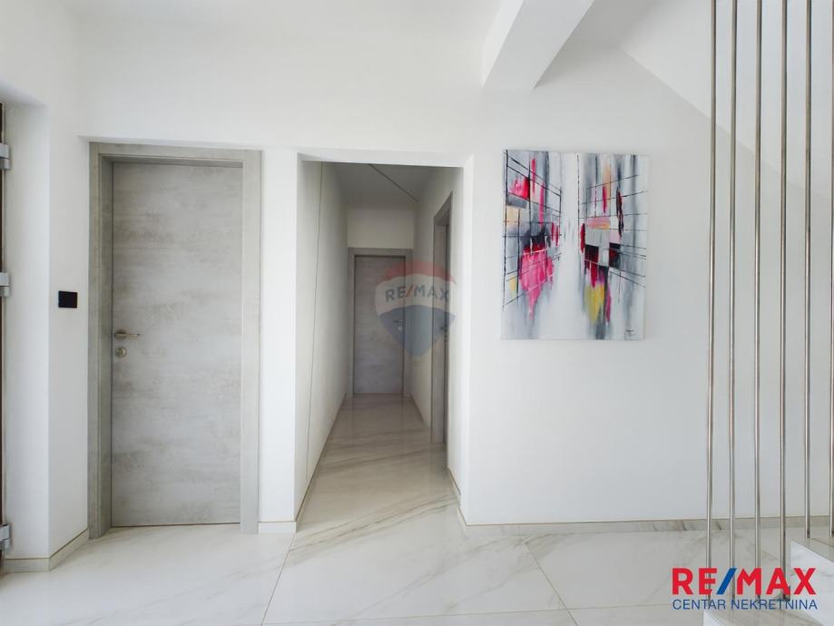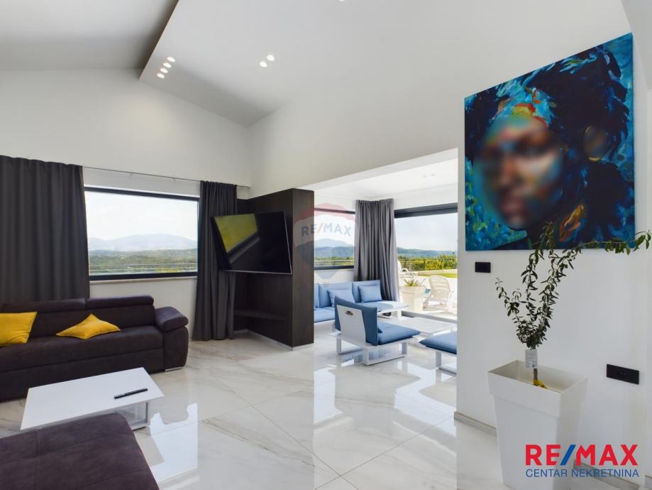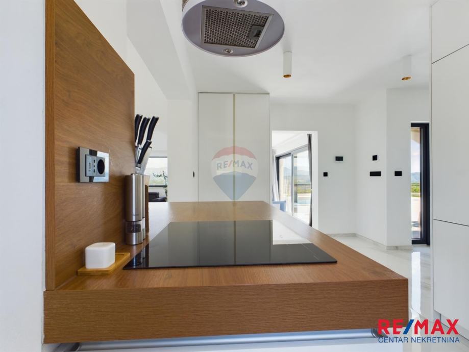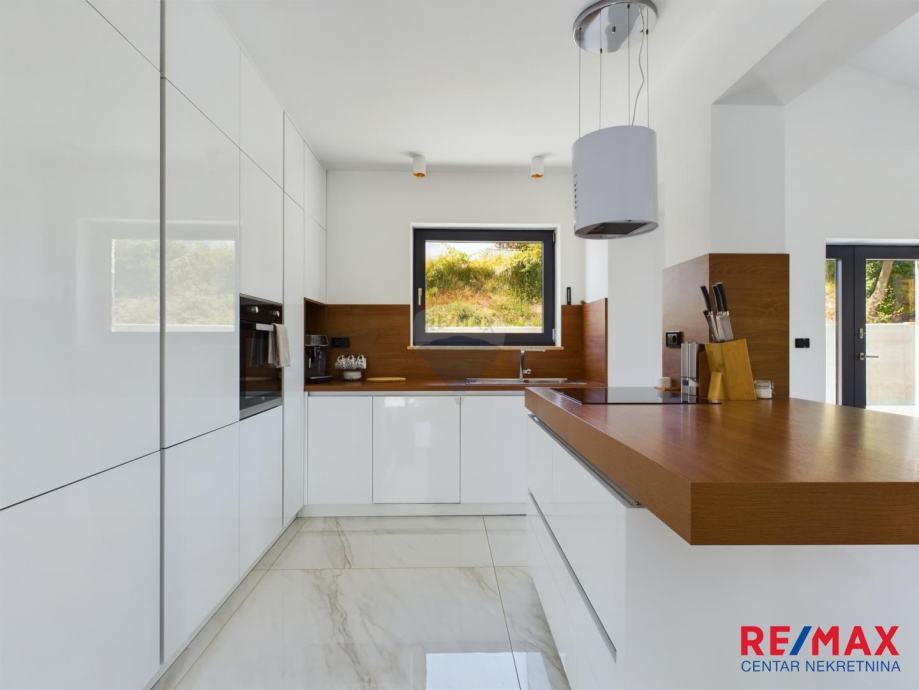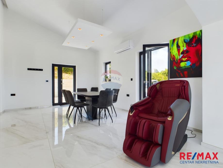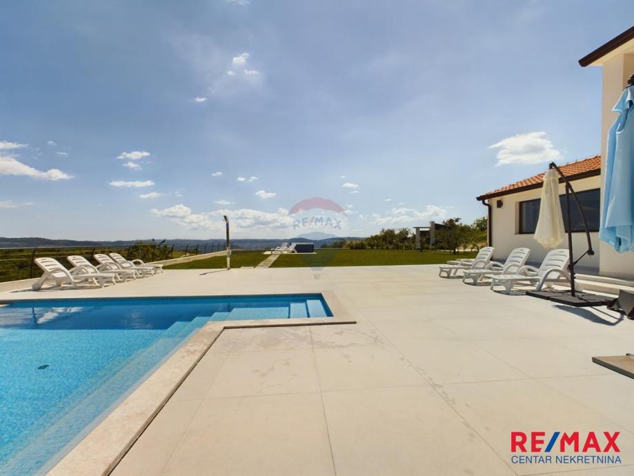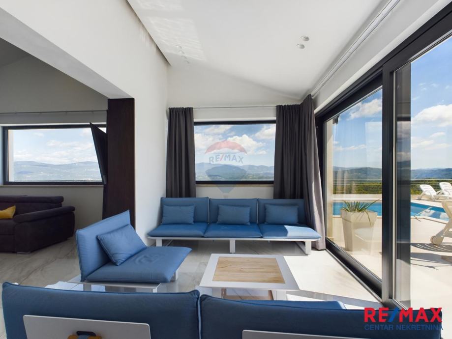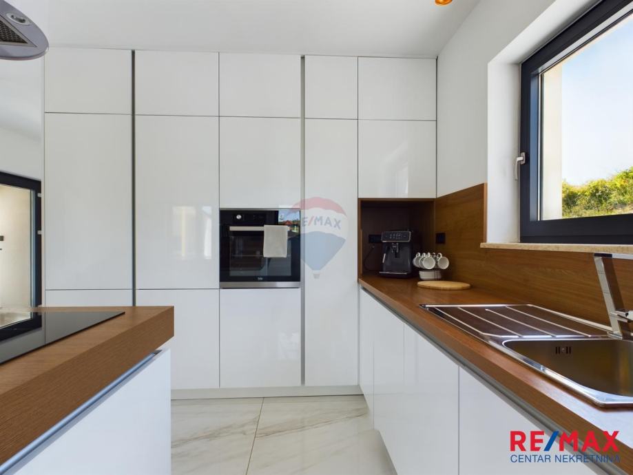 Na pola puta između Motovuna i Buzeta, na samom vrhu brežuljka smještena je ova moderna vila na 3300m2 okućnice. Iz same kuće pruža se impresivni pogled na istarski krajolik, Učku i Ćićariju. Okućnica je pomno uređena, na njoj nalazimo veliki bazen, hidromasažnu kadu i ljetnu kuhinju. Kuća je moderno uređena sa velikom pažnjom na detalje. Sastoji se od kuhinje, blagavaone i dnevnog boravka u open space konceptu. U prizemlju se još nalazi jedna kupaona, spavaća soba i fitness. Na katu se nalaze još dvije sobe, svaka sa svojom kupaonicom.